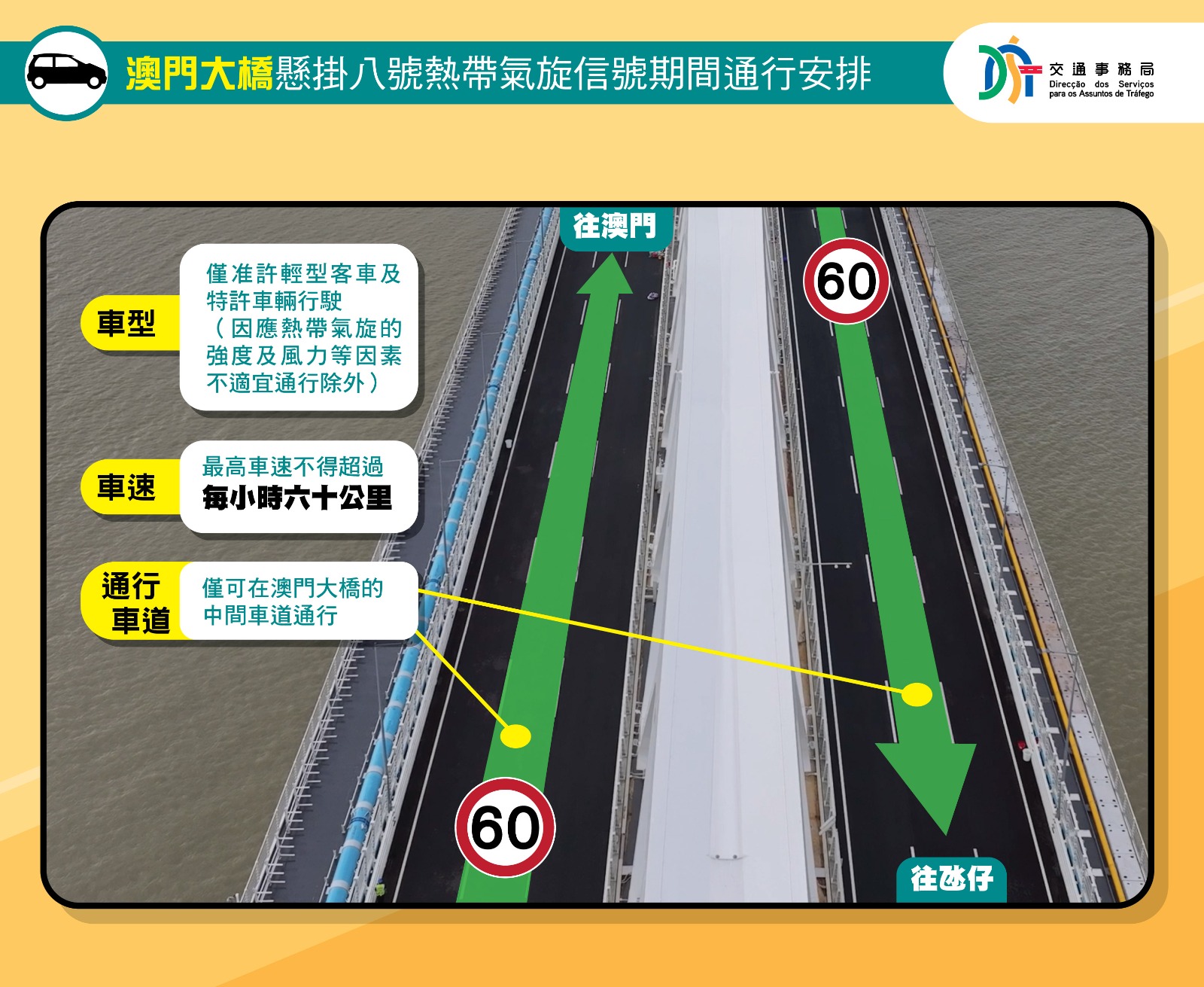 为保障安全,轻型客车于8号风球期间,在澳门大桥主桥通行时,务必在中间车道行驶,且最高车速不得超过每小时60公里,敬请驾驶者留意。