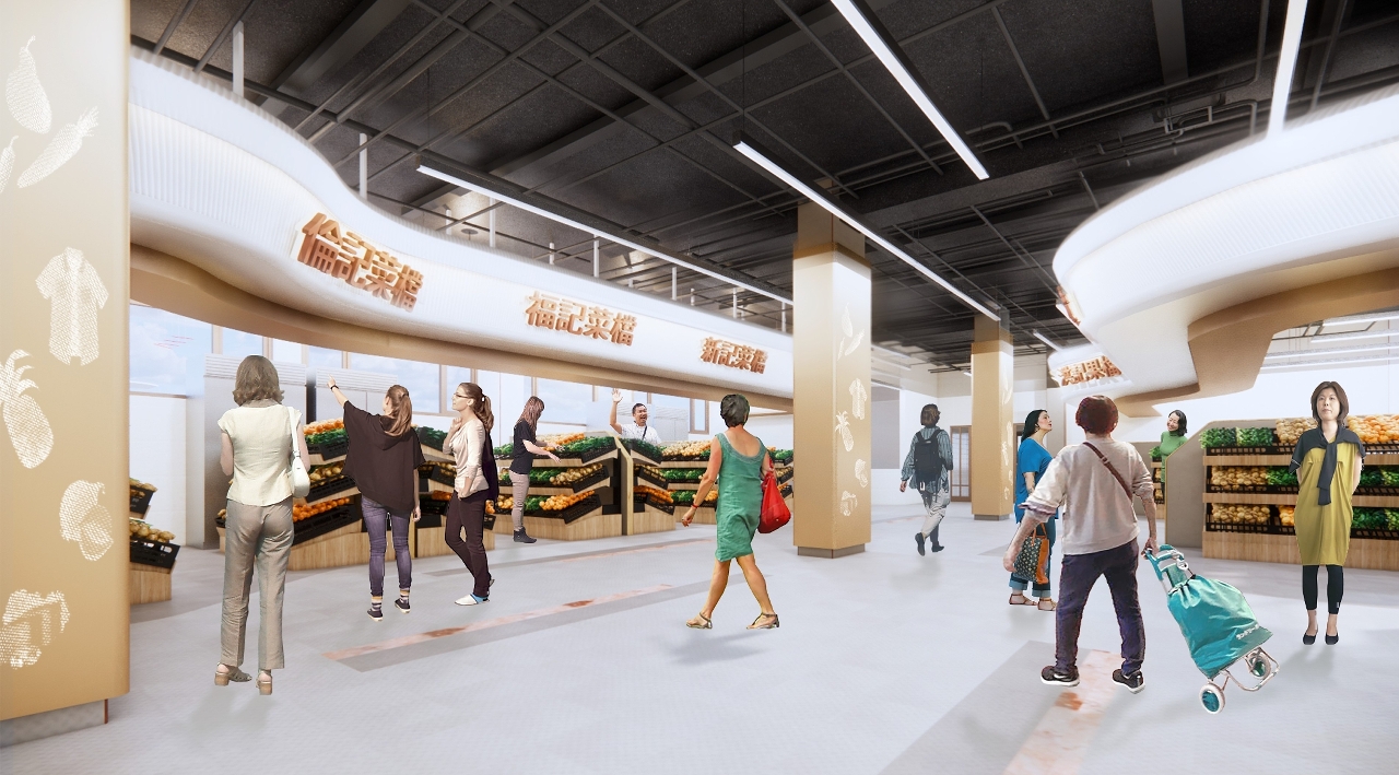 在空间设计方面,将保留原有的出入口,扩阔公共通道,增加摊檔面积,创建更舒适的营商环境及购物动线。其中,鱼类摊檔将采用干湿分离的设计,分隔售卖区和后勤区,并于售卖枱前增设挡板,挡水防溅。蔬菜及生果售卖区采用曲线设计,提高视觉宽敞度及货品展示的灵活性。一楼熟食区除熟食摊位外,还有适合经营轻食的开放式中岛设计摊位,为经营者及消费者提供多元、整洁的环境。