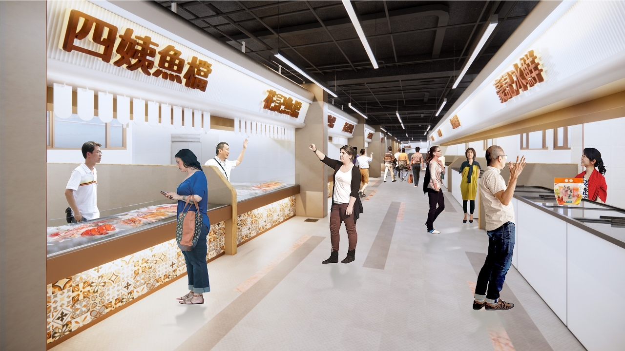 在整体布局方面,计划将所有鲜活食品摊檔集中于地面层经营,发挥群聚效应,提升消费者的购物体验,并按现有售卖种类重新规划布局,设鱼类售卖区、肉类售卖区、冰鲜售卖区、蔬菜及生果售卖区、传统百货摊檔等。一楼则计划引入熟食中心,设16个轻食及熟食摊位,把现时地面层的熟食檔迁至一楼经营,并增设逾150个食客座位,满足商贩及居民的诉求。