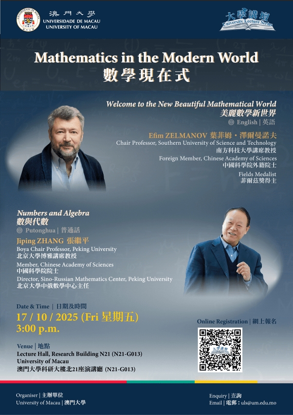 澳门大学将于10月17日(星期五)举办“大学讲坛”,南方科技大学讲席教授Efim Zelmanov及北京大学博雅讲席教授张继平分别以“美丽数学新世界”及“数与代数”为题发表演说,探讨数学学科的发展。欢迎有兴趣人士参加。