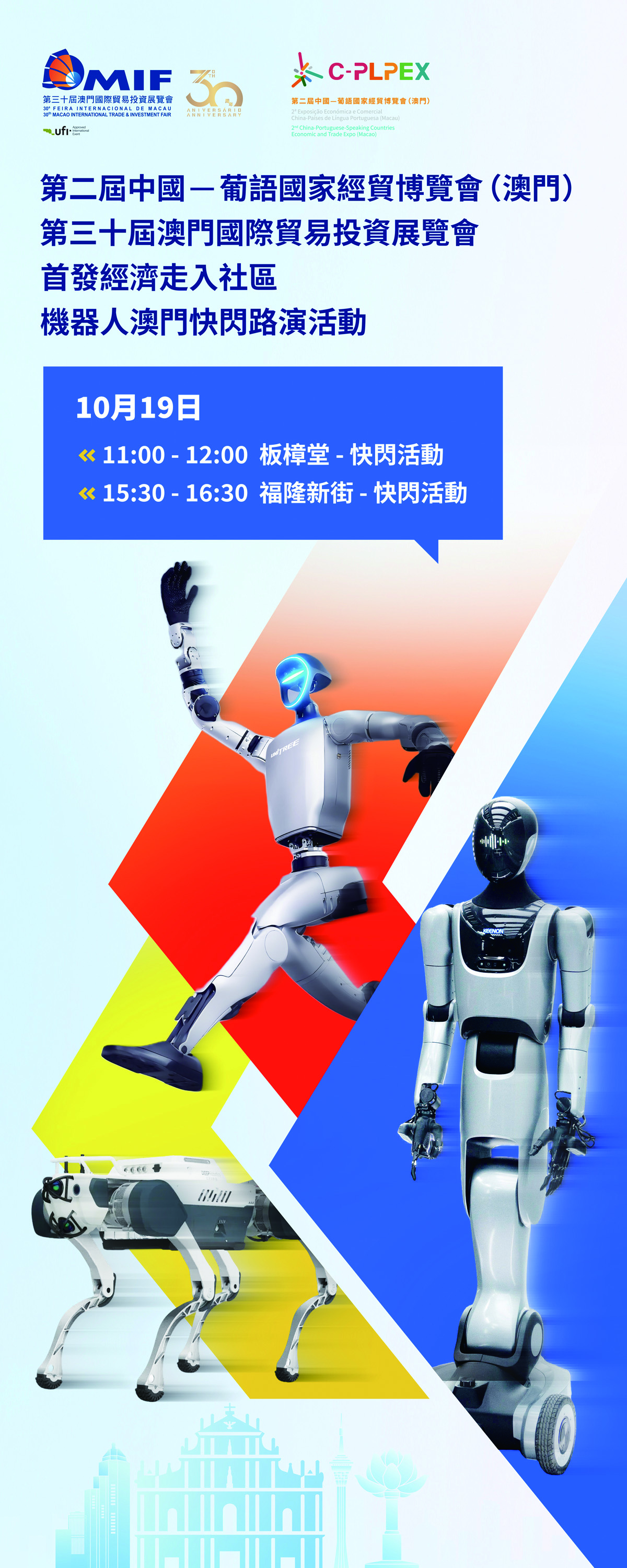大会将于10月19日安排在澳门首发的机器人,快闪至玫瑰母堂前地、福隆新街等社区,向市民及旅客派发礼物及互动合照打卡,作为展会的预热宣传,及庆祝“澳门国际贸易投资展览会”三十周年,欢迎公众到场参与。