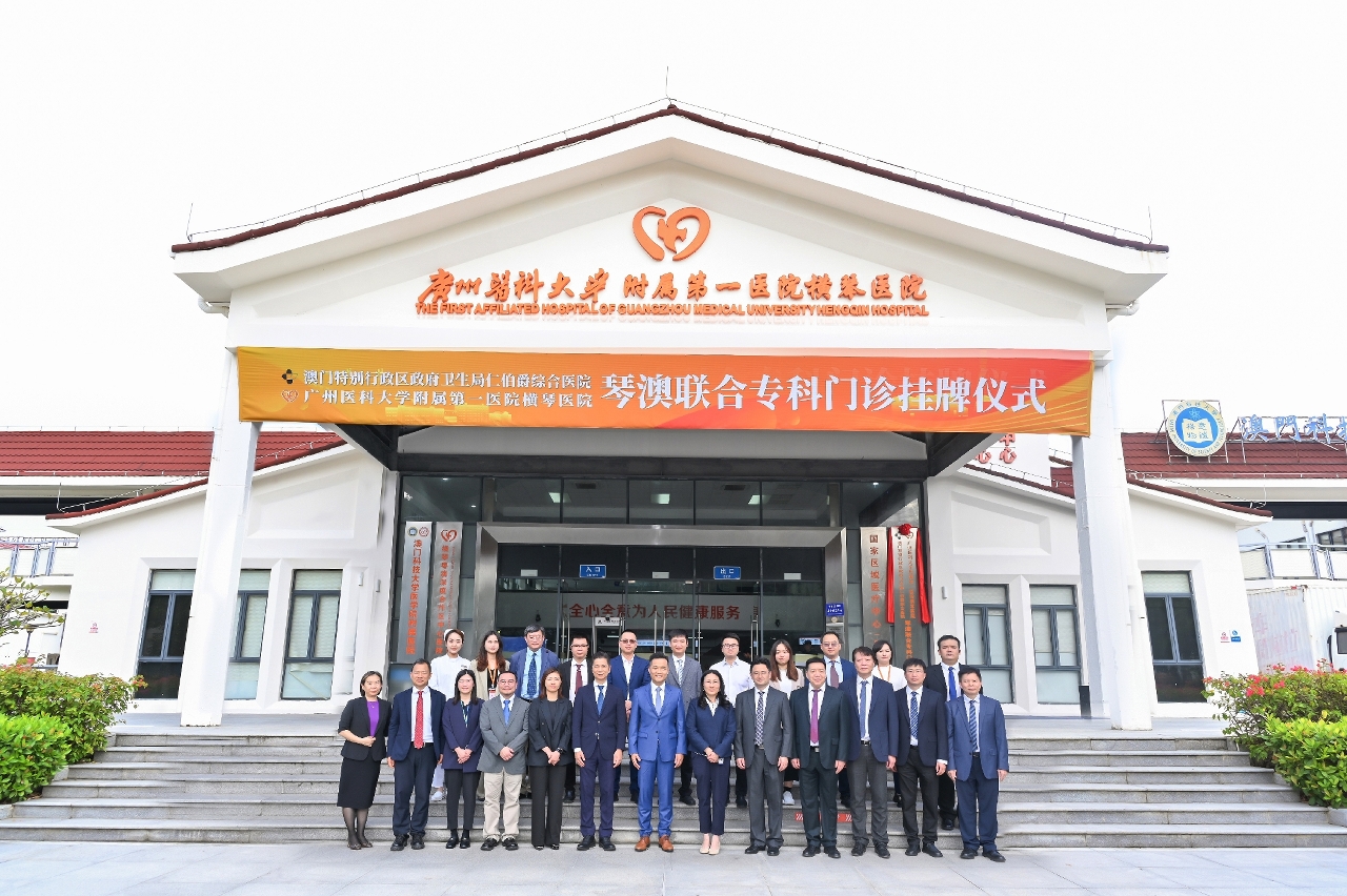 澳门特别行政区政府卫生局仁伯爵综合医院与广州医科大学附属第一医院横琴医院(下称“广医一院横琴医院”)于今(30)日在横琴粤澳深度合作区举行“琴澳联合专科门诊”挂牌仪式,标志着澳琴医疗一体化进程迈向新阶段。卫生局局长罗奕龙、横琴粤澳深度合作区民生事务局局长冯方丹、卫生局仁伯爵综合医院代院长戴华浩、横琴粤澳深度合作区民生事务局副局长苏凯慈、广医一院横琴医院院长黄锦坤、党委书记张挪富等嘉宾出席并主持了挂牌仪式。