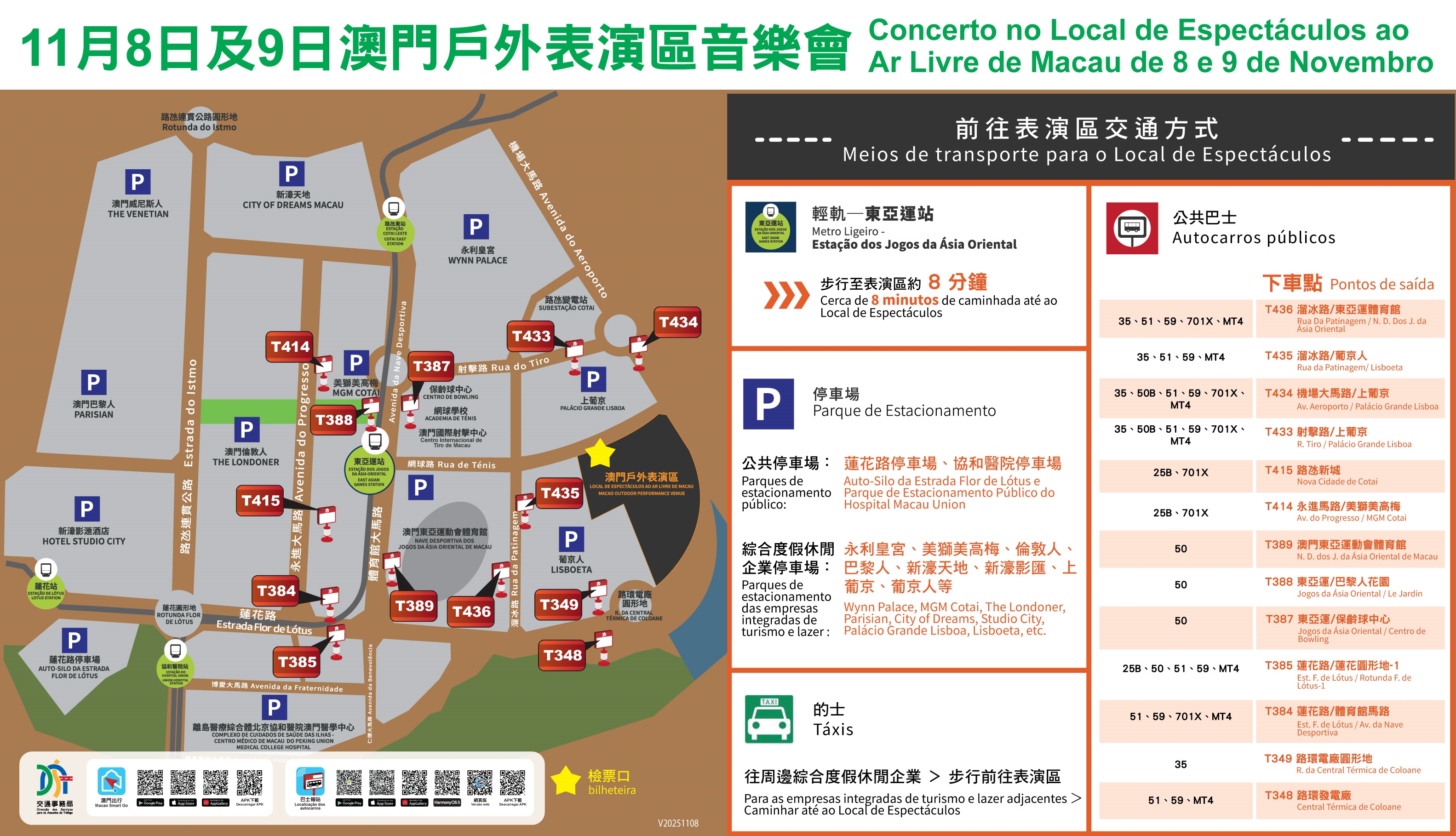 交通事务局建议观众使用公共运输,驾驶者可停泊于表演区外的公共停车场或综合度假休闲企业停车场,并请预早规划行程,遵从现场指示。详情可浏览交通事务局网站(连结:https://www.dsat.gov.mo/dsat/subpage.aspx?a_id=1762478733)。
