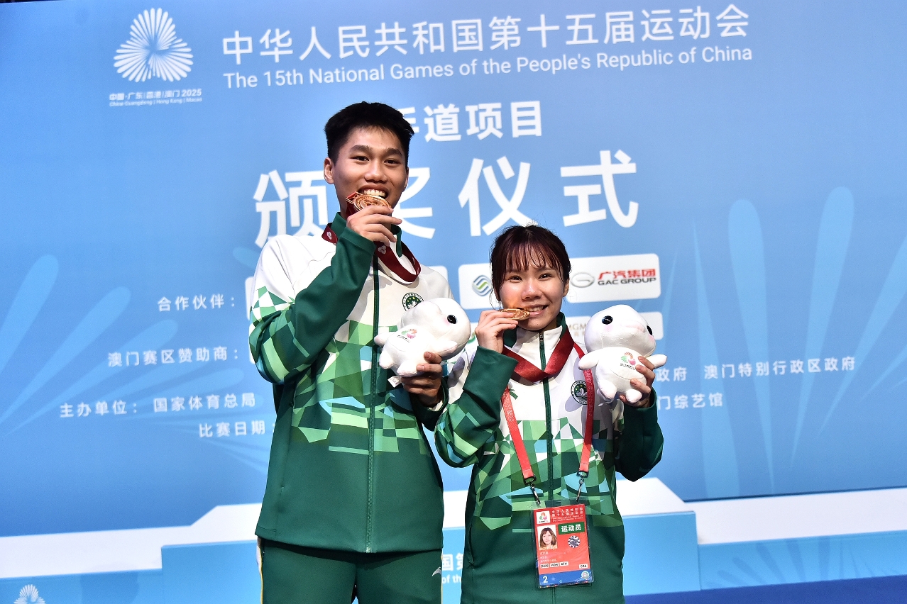 『第十五届全国运动会』开幕前夕,澳门空手道队在组手项目继续迎来喜讯,今(8)日在综艺馆的主场气势下,凭藉方文慧(FONG MAN WAI)及容君灏(IONG KUANG HOU)分别于女子-55公斤级和男子-67公斤级夺金,加上许家诚(XU JIA CHENG )与李康乔(LEI HONG KIO)各摘一铜,在最后一天比赛一口气为澳门进账共4面奖牌,至今于本届全运会已取得3金2铜,并将澳门参加全运会以来所获的奖牌累积至3金3铜。
