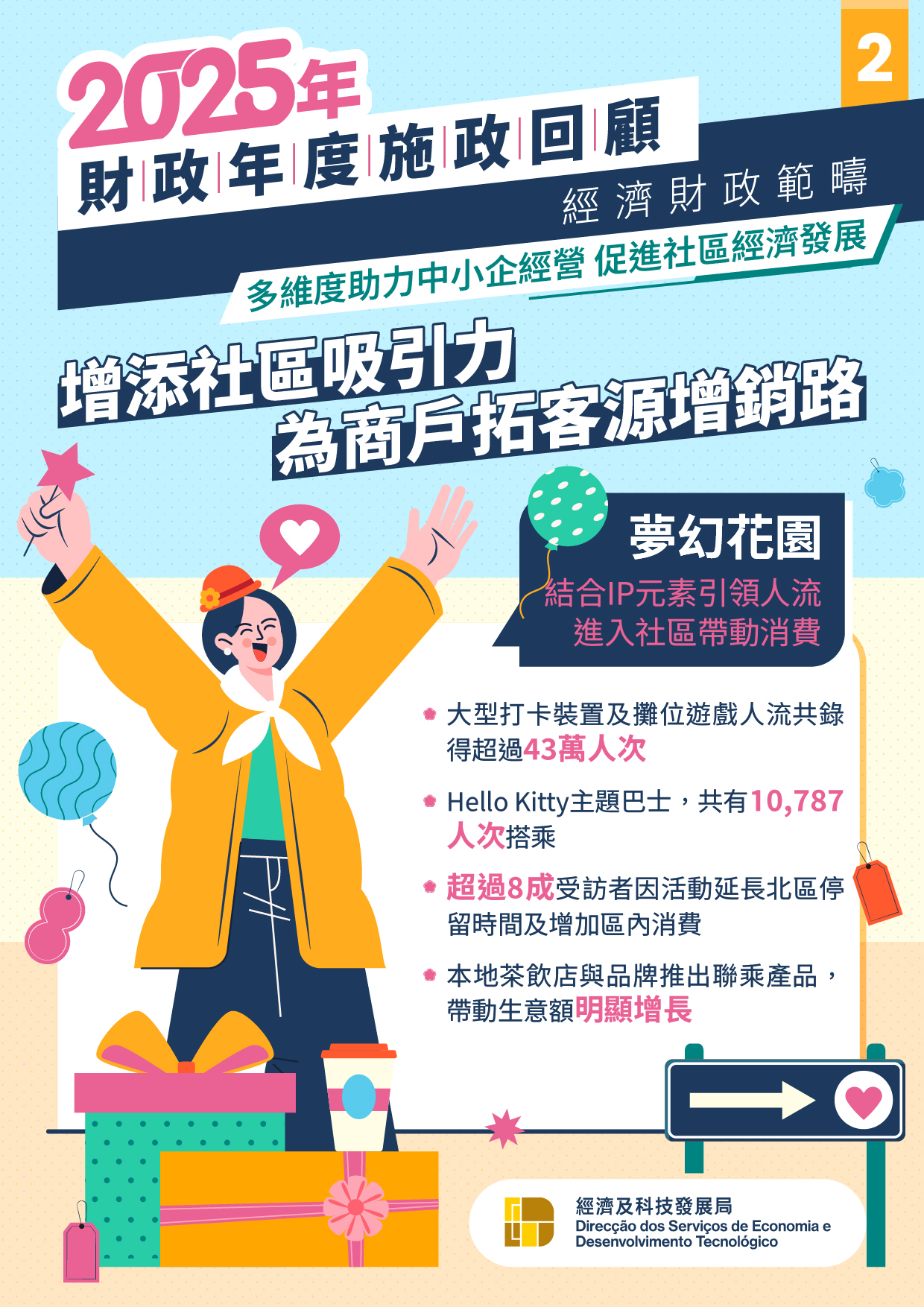 经济及科技发展局(下称“经科局”)与国际知名品牌合作举办“Sanrio characters梦幻花园”,吸引更多旅客及居民入区游览及消费。活动的两个大型打卡装置及摊位游戏共吸引超过43万人次。问卷调查显示超过八成受访者表示延长了在北区的时间及增加消费。活动期间,有本地茶饮店与相关品牌合作推出特色联乘产品,商户表示联动既提升客流及提高品牌知名度,亦带动生意额明显增长。