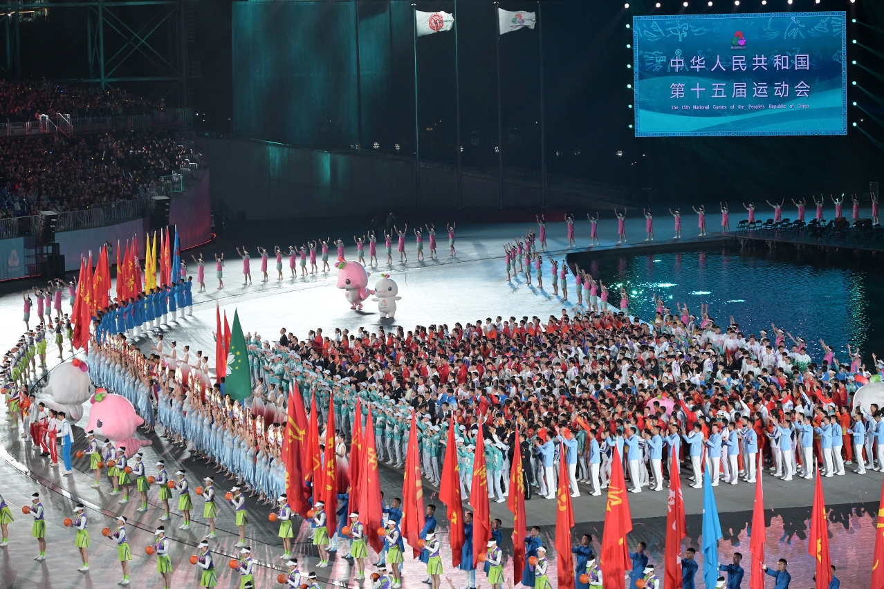 随后进行了全运会会旗交接仪式,十五运会组委会3位执行主任,澳门特区行政长官岑浩辉、香港特区行政长官李家超、广东省省长孟凡利先后接过会旗,并交予十五运会组委会主任、国家体育总局局长高志丹,最后由局长高志丹将会旗移交予湖南省省长毛伟明,标志着2029年在湖南省举行的十六运会筹备工作正式启动。