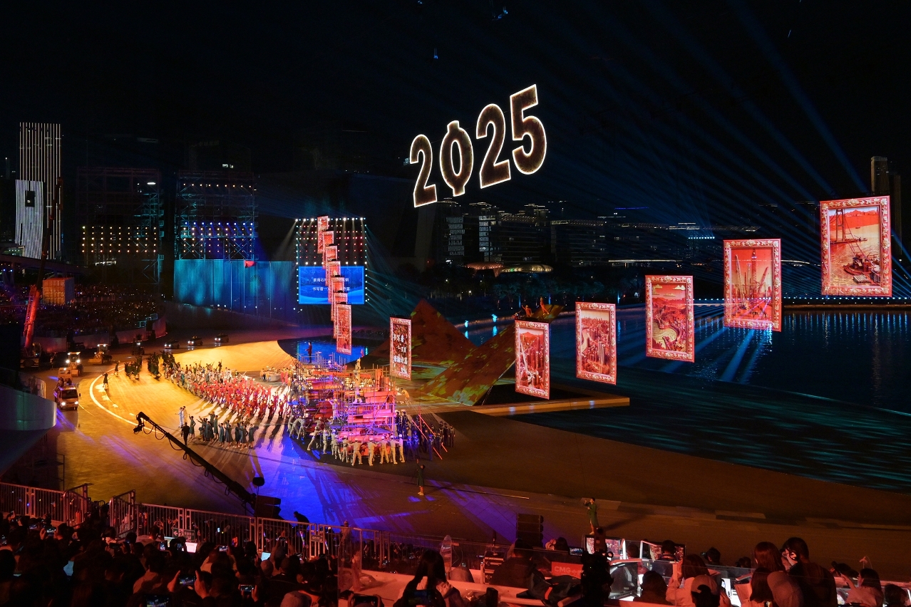 此外,闭幕式另一亮点是安排了一系列精彩文体展演,汇演整体以「星辰大海」为主题,并以「海天为幕,城市为景」打造了全球首个城市全景的闭幕式,同时结合科技元素、岭南历史及粤港澳大湾区的人文特色,为十五运会闭幕式划上完满句号。