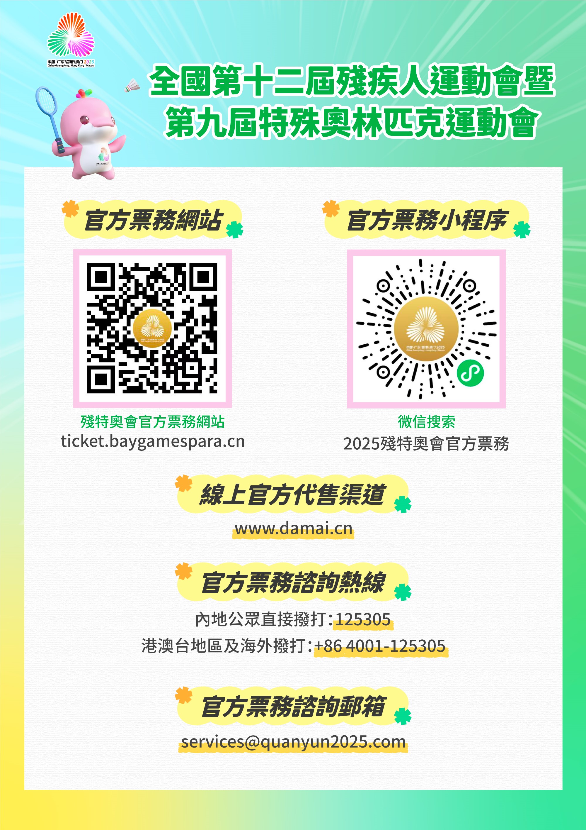 澳门赛区筹备办公室提醒公众应提前细阅持票须知ticket.baygamespara.cn/hant/#/news/detail/0/37,并应循官方合法渠道购票,切勿炒卖门票及向身份来历不明人士购买门票,以免堕入骗局而招致财产损失。如在购票过程中遇到疑问,可拨打官方票务热线(内地公众直接拨打:125305,港澳台地区及海外拨打:+86 4001-125305)或发送邮件至官方票务服务邮箱(services@quanyun2025.com)查询。如欲参阅更多赛事资料,可浏览赛事官方网页www.2025nationalgames.gov.mo./zh-hant/paralympics。同时,欢迎关注“第十五届全运会澳门赛区”Facebook专页及“全运会残特奥澳门赛区”微信公众号。