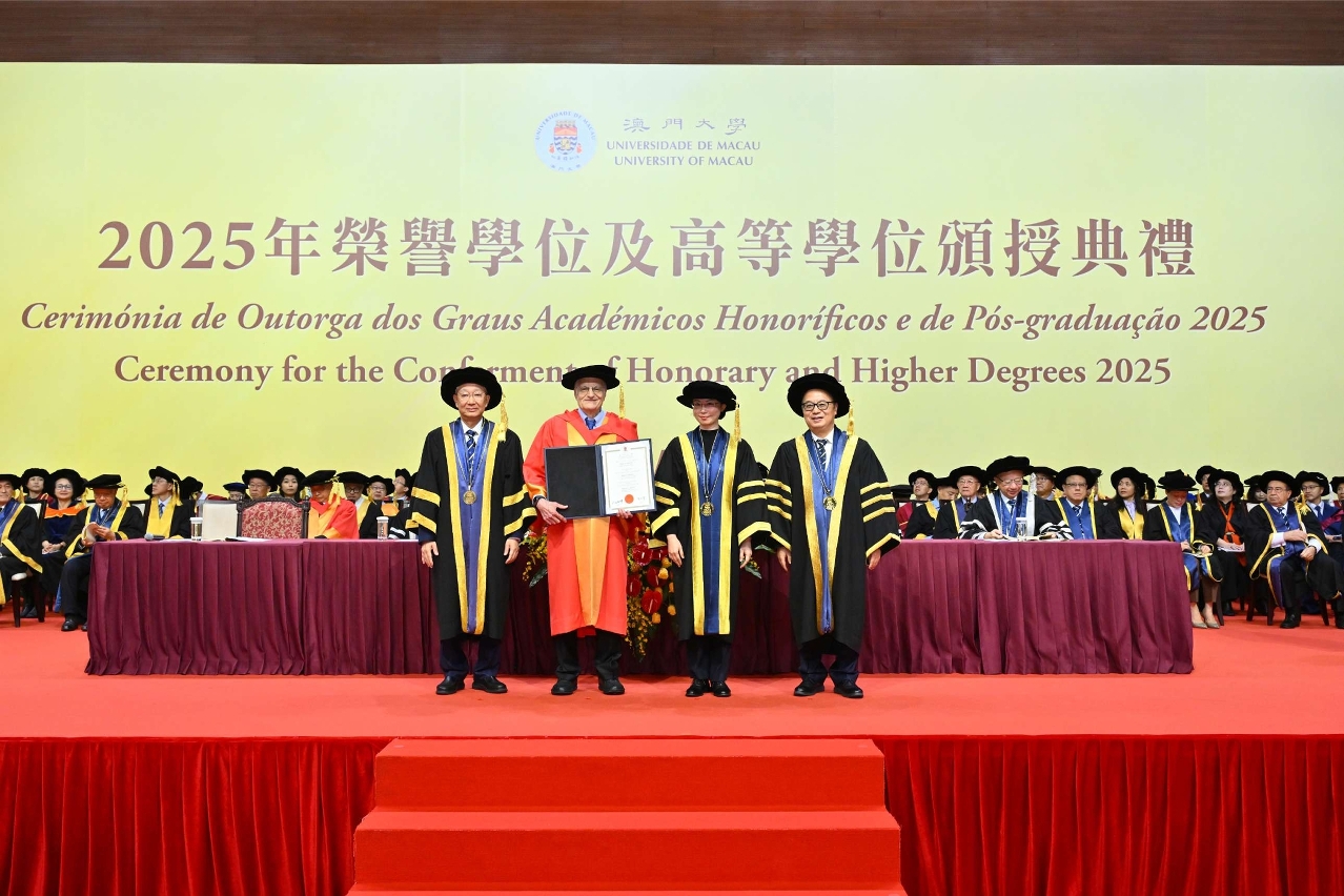澳门大学今(30)日举行2025年荣誉学位及高等学位颁授典礼,向材料科学晶体结构领域权威学者张泽及诺贝尔经济学奖得主汤玛斯‧萨金特(Thomas J. Sargent)颁授澳大荣誉博士学位,以表彰其卓越成就及为社会所作出的重大贡献。