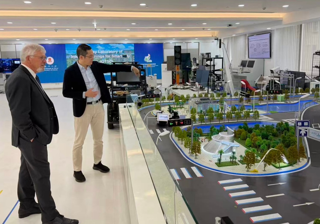 代表团参观了澳大模拟与混合信号集成电路全国重点实验室及智慧城市物联网全国重点实验室,深入了解澳大近年的科研成果、人才培养模式、科研发展布局及横琴合作区校区的建设计划。Joe Chicharo对澳大的发展及科研成果给予高度评价。