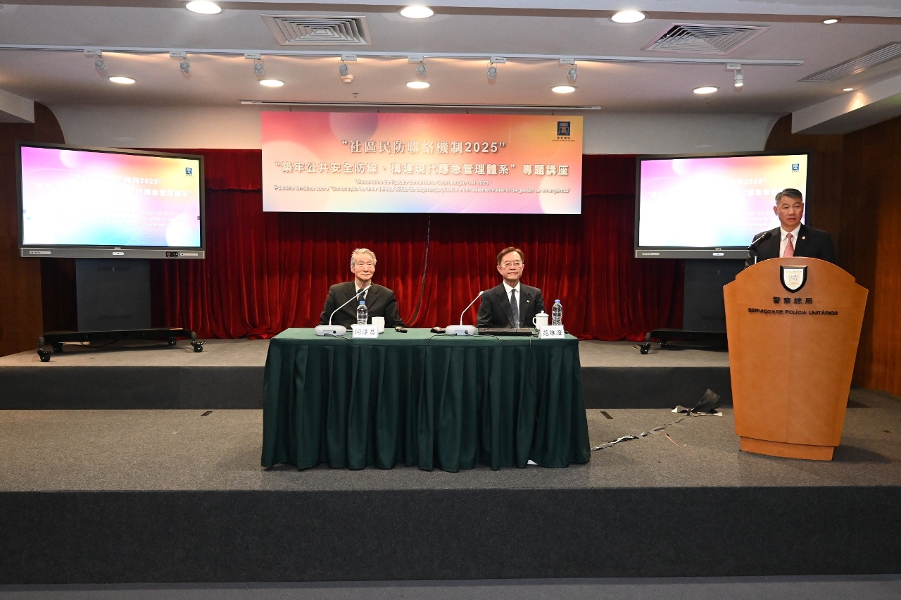 为深化民防范畴各部门对国家“大安全、大应急”框架的理解,进一步提升澳门城市安全治理水平,警察总局于12月4日在出入境事务大楼举办专题讲座,主题为“筑牢公共安全防线,构建现代应急管理体系”。讲座特邀原国务院参事、原国家减灾委专家委副主任闪淳昌教授,以及中国工程院院士、清华大学公共安全研究院院长范维澄教授担任主讲嘉宾。保安司司长陈子劲、警察总局局长梁文昌,联同民防架构、社区民防联络机制代表,以及民防志愿者合共140人出席。活动在各方代表的支持下,设有40个线上直播点,线上参与总人数逾920人。