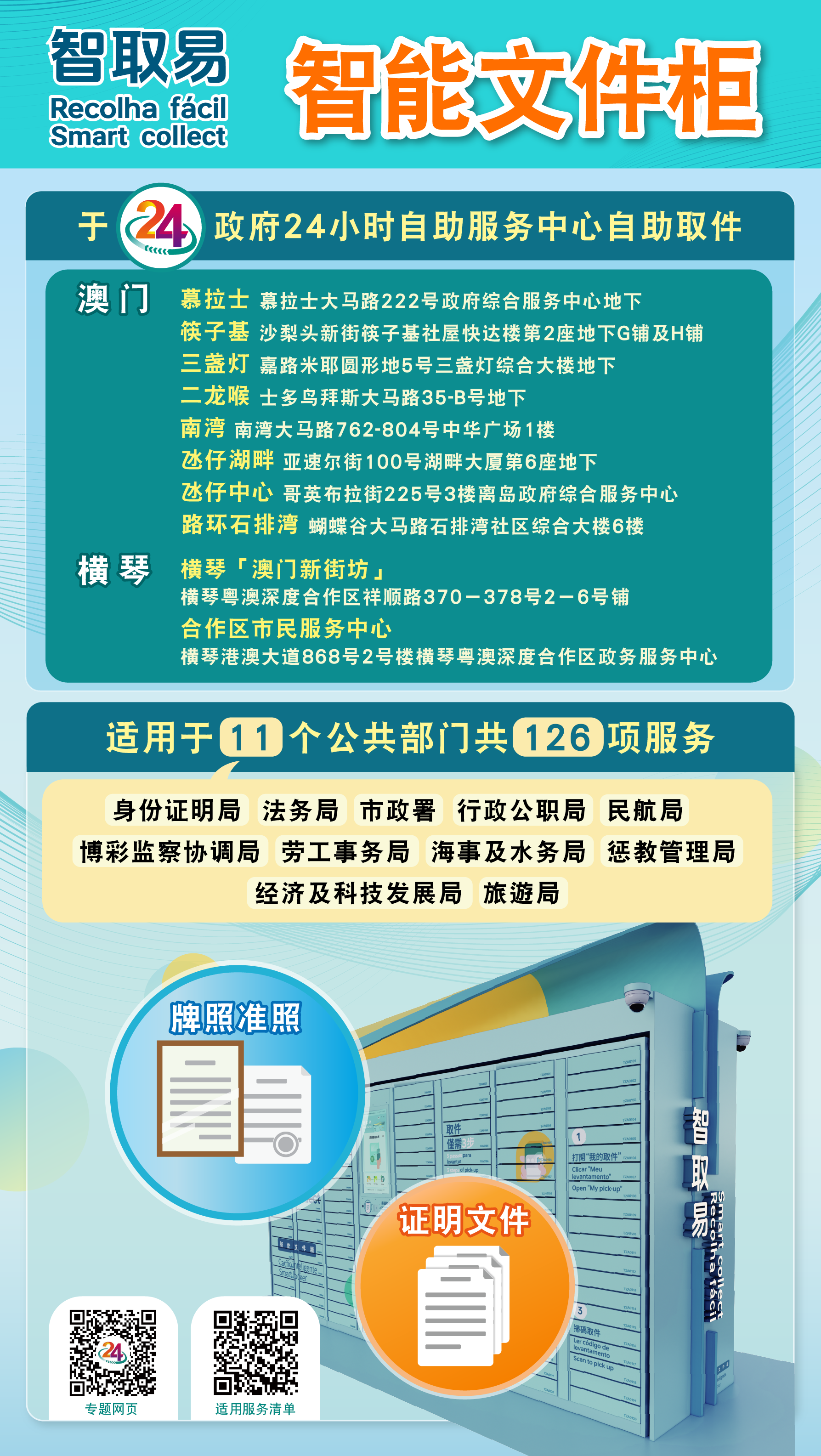 “智取易”智能文件柜提供24小时自助取件服务,方便市民、商企和社团在申请政府文件后,于澳门和横琴合作区各政府24小时自助服务中心的文件柜取件,不受部门办公时间限制。