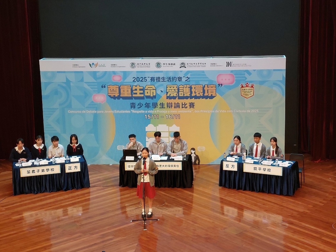 “尊重生命、爱护环境”青少年学生辩论比赛’,由市政署主办、澳门城市大学学生会协办、澳门演辩文化协会承办,来自不同大专院校及中学组成了十五支参赛队伍,经过激烈的初赛与决赛,角逐广东话少年组、广东话青年组及普通话组的各个奖项,两日比赛逾五百人次参与。透过比赛提升了学生对社会事务的兴趣,并有助锻练逻辑思维、语言表达与团队合作等能力。
