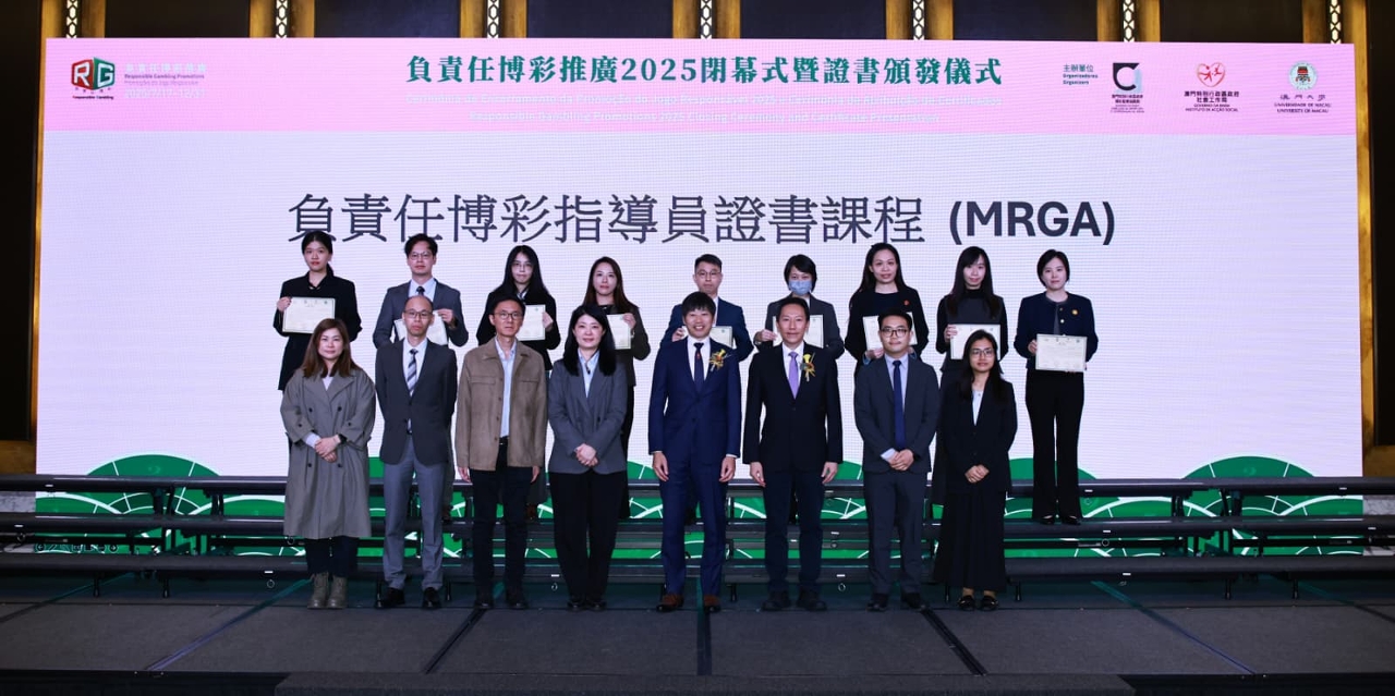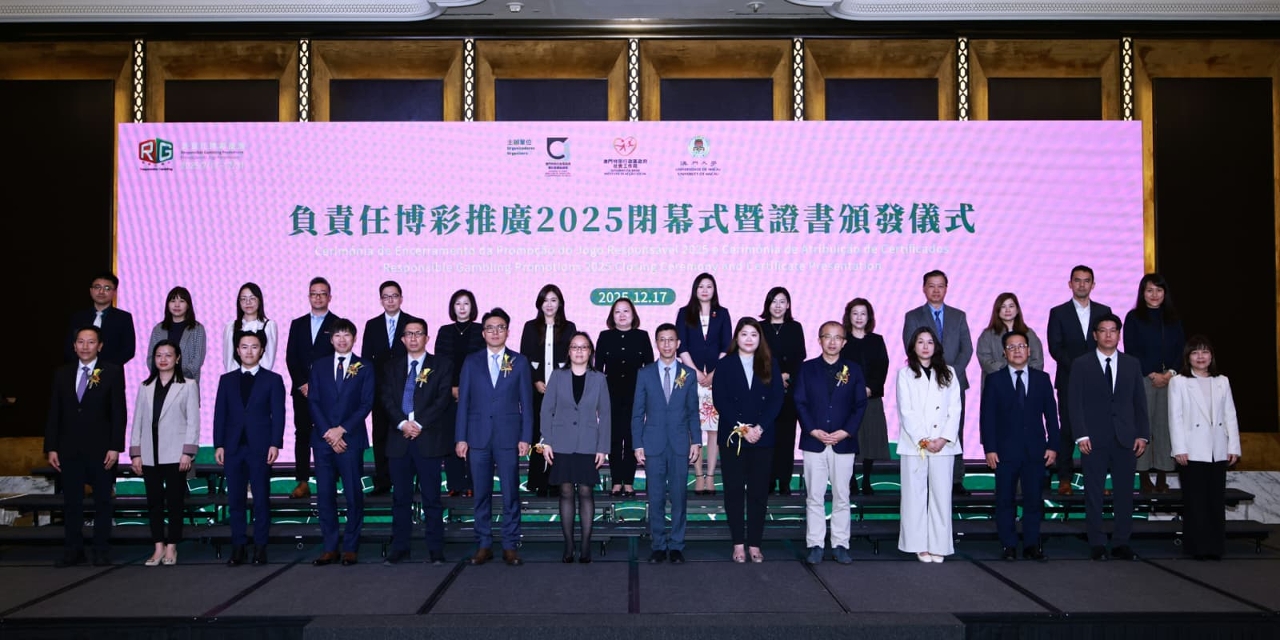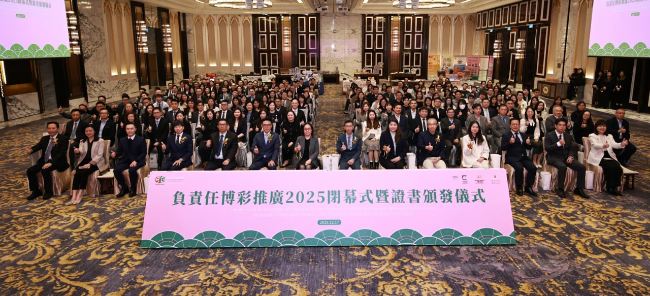 由社会工作局、博彩监察协调局及澳门大学博彩研究所合办的“负责任博彩推广2025闭幕式暨证书颁发仪式”,于12月17日下午在美狮美高梅酒店宴会厅顺利举行,来自博彩业界、社会服务界及学术界专家学者逾180人出席。