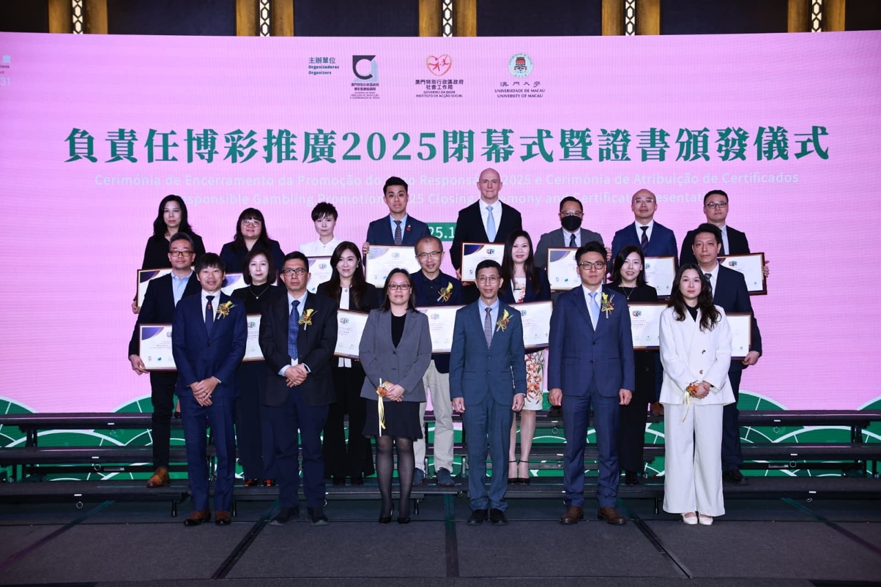 在闭幕仪式上,主办单位向15间经负责任博彩工作小组评审获“负责任博彩执行模范单位”之娱乐场及其他博彩场所授予资格奖座,以及向175名分别完成“澳门赌博辅导员专业证书课程”、“澳门负责任博彩指导员证书课程”及相关导师证书课程人士颁发证书,持续推动本澳负责任博彩及赌博失调防治体系朝向专业化发展。会场亦设有摊位展示系列活动成果,为与会者搭建经验交流平台。