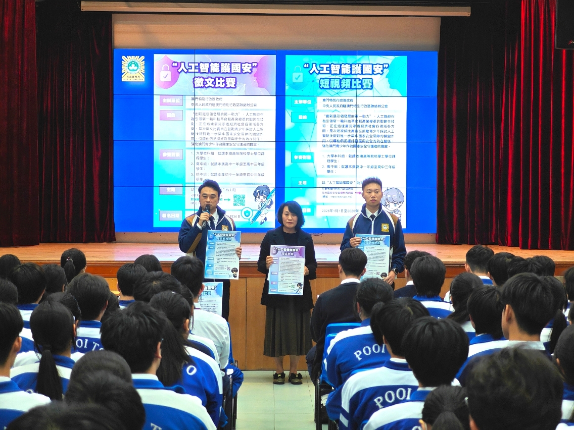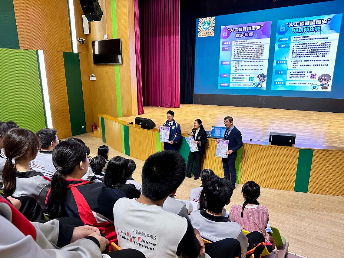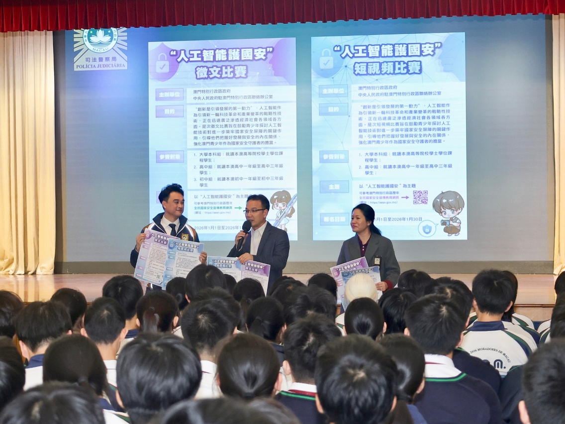 由澳门特别行政区政府与中央人民政府驻澳门特别行政区联络办公室联合举办的“人工智能护国安”征文及短视频比赛现正接受报名。司法警察局积极派员走访本澳各高等院校及中学,推广宣传并鼓励学生踊跃参与。