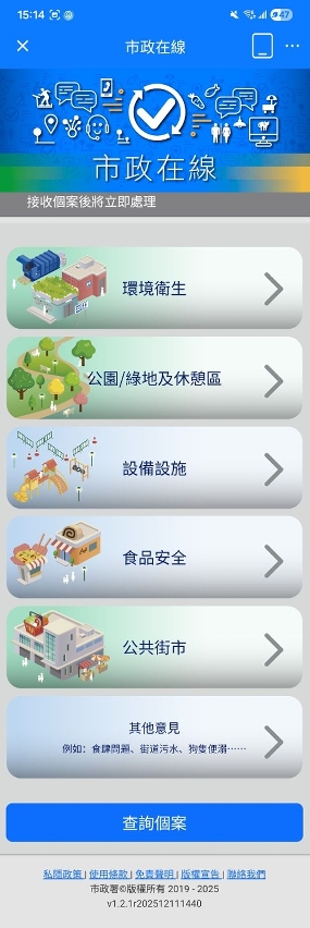 由2026年1月1日起,市政署将扩大服务的覆盖面,于即时反映意见的功能中,增加「公共街市」范畴,当中包括「街市内占用公地」、「街市内公秤」及「街市内摊贩价目标识」;另外,在「环境卫生」范畴内,亦新增「公共地方发现动物尸体」项目。市民只须透过手机定位、相片、文字或语音等方式提供市政意见,市政署接收个案后,随即安排人员跟进,大大提高了处理问题的效率。
