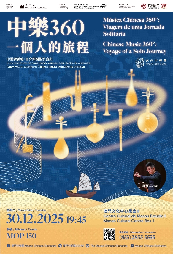由文化局主办,澳门乐团有限公司承办,澳门中银支持的澳门中乐团乐季《中乐360》音乐会,将于12月30日(周二)晚上7时45分在澳门文化中心黑盒剧场II上演。《中乐360》将突破惯常欣赏音乐会的安排,让观众的多重感官沉浸于音乐会之中,享受一趟独游音乐旅程。