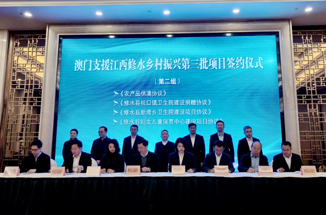 2025年12月30日上午,澳门支援江西修水乡村振兴第三批项目签约仪式举行。澳门特别行政区政府政策研究和区域发展局局长张作文,中央人民政府驻澳门特别行政区联络办公室经济金融部副部长杨全州,江西省苏区办副主任傅小鹏,江西省港澳办副主任陈俊,九江市政府副市长杜少华,修水县委书记郑庆华,修水县委副书记、县长刘婕出席,出席签约仪式的还有澳门特区政府政策研究和区域发展局、澳门中联办经济金融部、澳门特区政府文化局、澳门蔬菜批发商商会、澳门直播协会、澳门江西同乡会、澳门记者联会、澳门部分优秀企业和省发改委、省港澳办等单位有关领导和嘉宾。签约仪式由刘婕主持。