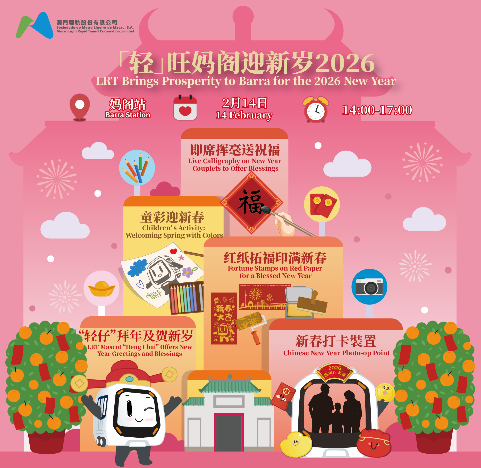新春将至,澳门轻轨股份有限公司(下称「轻轨公司」)特别推出「轻」旺迎新岁2026系列活动,与市民及旅客共贺佳节。除了在新春期间推出主题列车增添节日色彩外,轻轨公司也将于2月14日(年廿七)在轻轨妈阁站举办「『轻』旺妈阁迎新岁」活动,现场将免费赠送贺年挥春,并提供自助印制利是封等互动体验,与市民及旅客一同提前感受新年气氛。