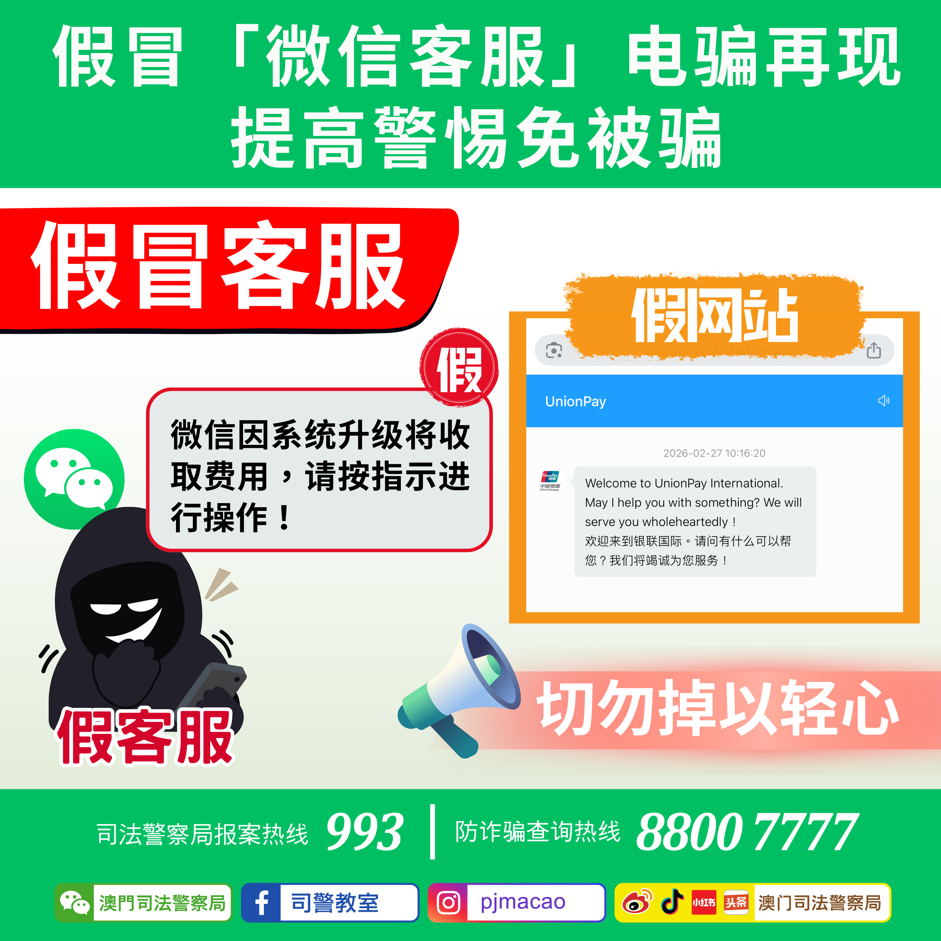 司法警察局今日(2月27日)接获市民举报,指接获假冒「微信客服」的诈骗电话。骗徒在通话中声称,事主于开通微信帐号时,已同时启用「支付及汇率相关服务」,并讹称现因系统升级将开始收取费用。如事主欲取消服务,需按照「客服」指示进行操作。