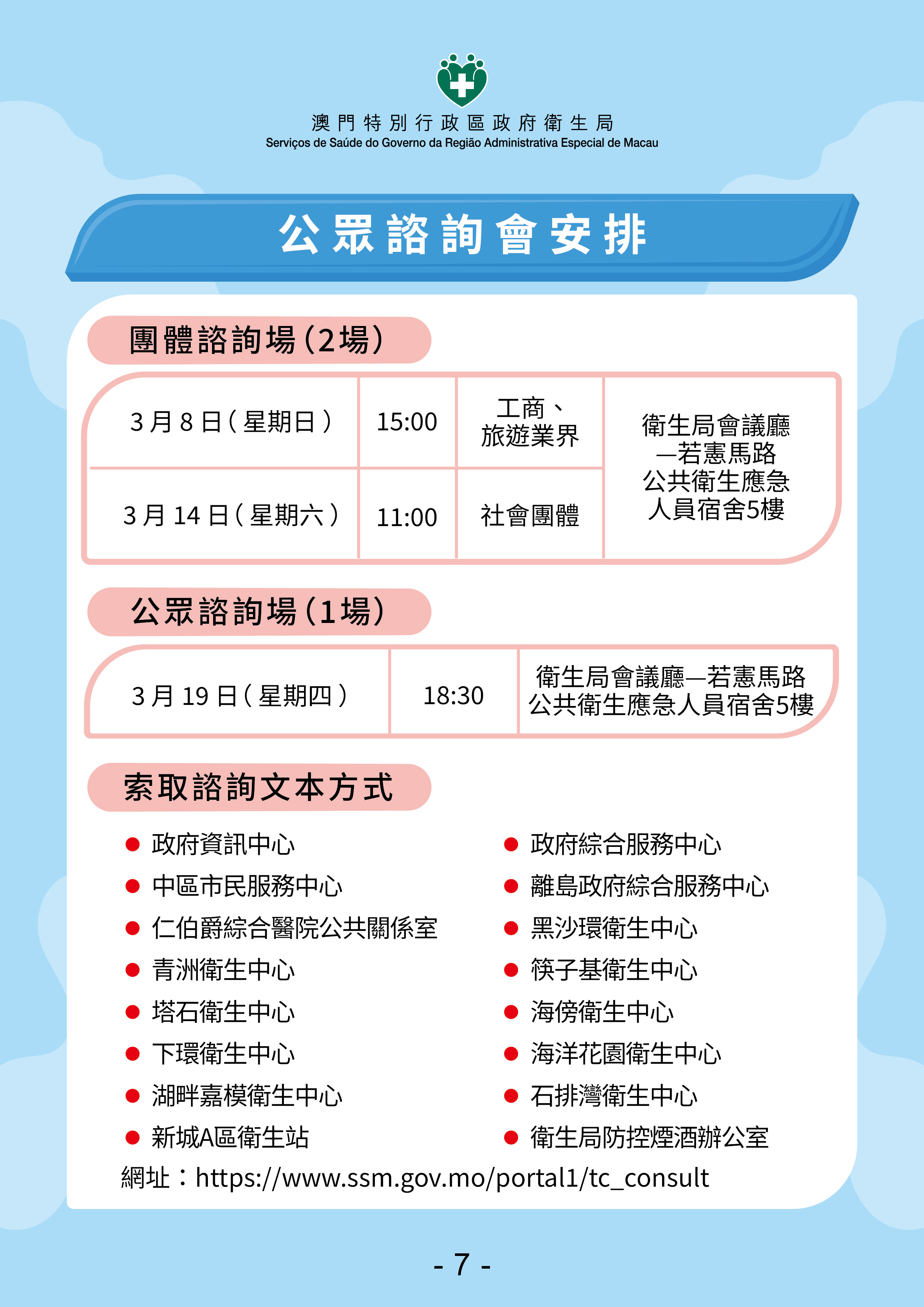 此外,3月19日下午6时30分于卫生局会议厅(若宪马路公共卫生应急人员宿舍5楼)举行“公众专场”咨询会,有意参与者请于专题网页预先登记。