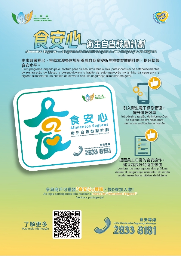 四月份“食品卫生督导课程”现正接受报名,报名日期至三月二十六日,有关课程资讯或报名详情可扫描宣传单张上的二维码、浏览市政署食品安全资讯网 www.iam.gov.mo/foodsafety、澳门生产力暨科技转移中心网站 www.cpttm.org.mo/training,或致电2878 1313查询。