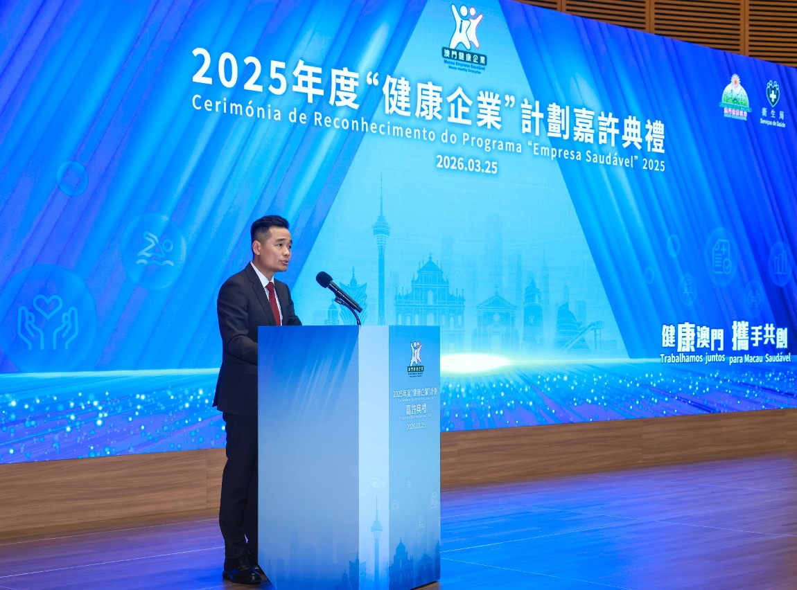 2025年度“健康企业”计划嘉许典礼于今(25)日圆满举行,中央人民政府驻澳门特别行政区联络办公室人事部部长及社会发展部部长艾一平、卫生局局长罗奕龙、劳工事务局代局长陈俊宇、新闻局代局长杨宝琴、社会工作局副局长许华宝、司法警察局副局长岑锦荣、海事及水务局副局长唐玉萍、治安警察局代副局长郑俊禧、教育及青年发展局代副局长陈旭伟等出席了典礼,向2025年度达标的26家企业颁发“健康企业”嘉许奖座,并向表现突出的企业颁发卓越奖,包括6个“卓越健康企业奖”及3个“卓越健康员工餐厅奖”,以表彰其过去一年在推动员工福祉、优化职场环境及落实相关措施方面的积极行动。