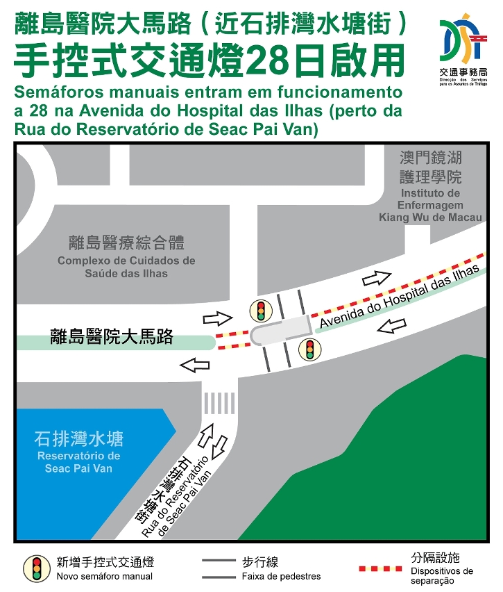 经综合分析离岛医疗综合体周边道路的交通条件以及平衡行人和驾驶者的需要,保障人车通行安全,交通事务局于离岛医院大马路近石排湾水塘街交界处,增设分段手控式交通灯设备,以优化行人往返离岛医疗综合体及石排湾住宅群的过路条件,相关设施将于28 日(周六)上午启用。