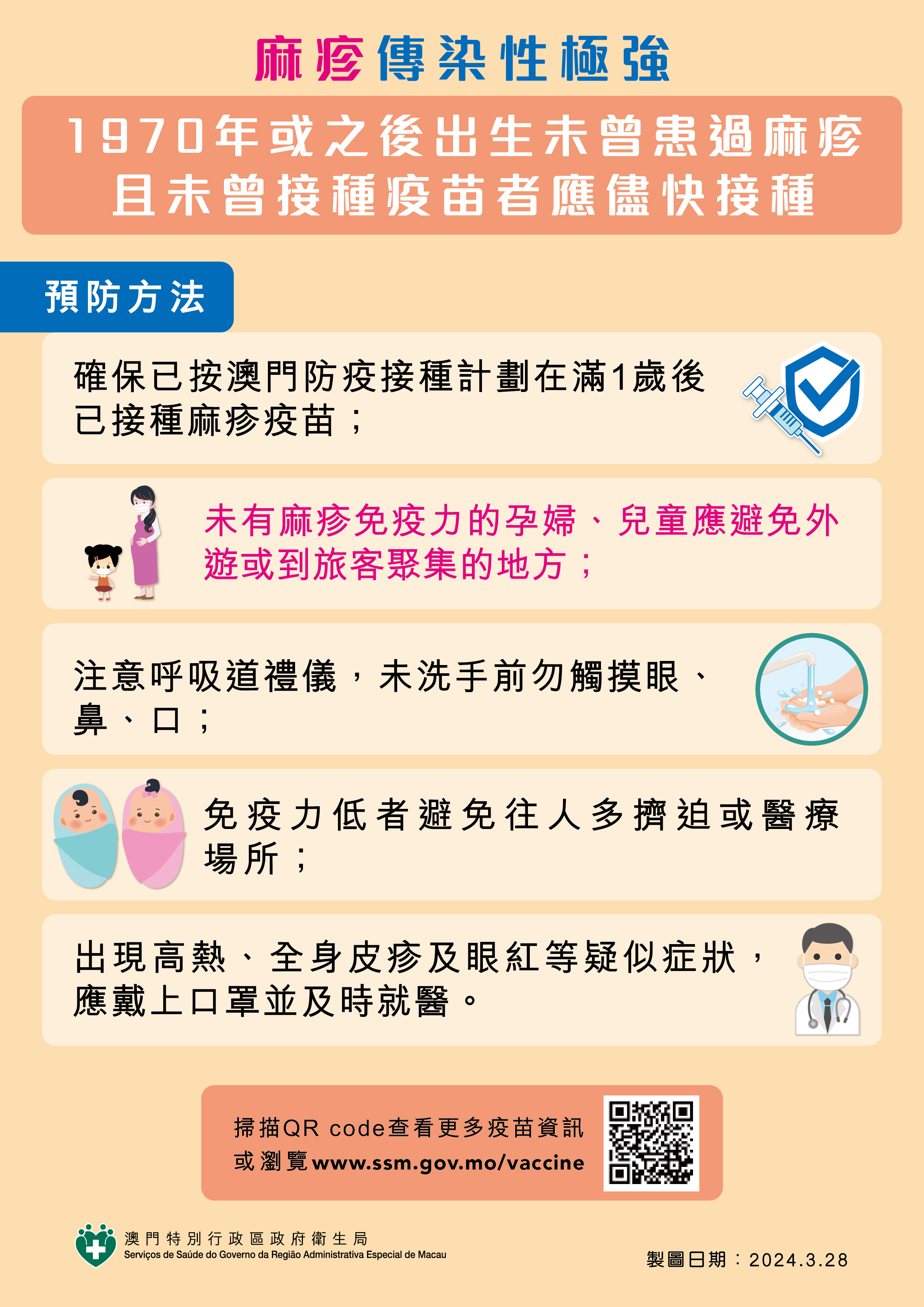 卫生局再次提醒居民,若外游期间或回澳后发热、全身皮疹及眼红等疑似麻疹症状,应尽快戴上口罩就医并告知医护人员详细旅游史及接触史。