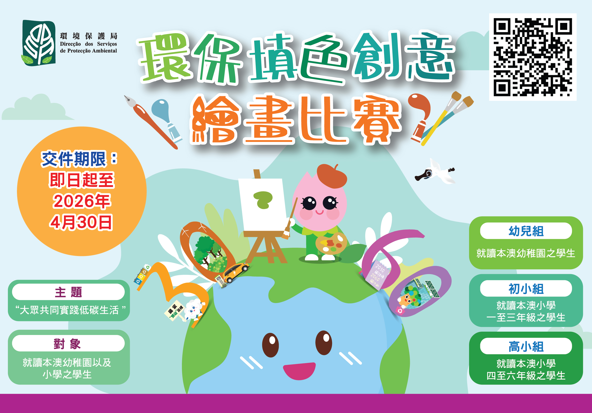 “环保填色创意绘画比赛”分为幼儿组、初小组以及高小组,每组将分别设有冠、亚、季军及校园优秀表现奖等奖项,作品可于2026年4月1日至30日递交至环境保护局。比赛详情可浏览环境保护局网页(www.dspa.gov.mo/drawingcompetition)或致电“环保热线”(2876 2626)查询。