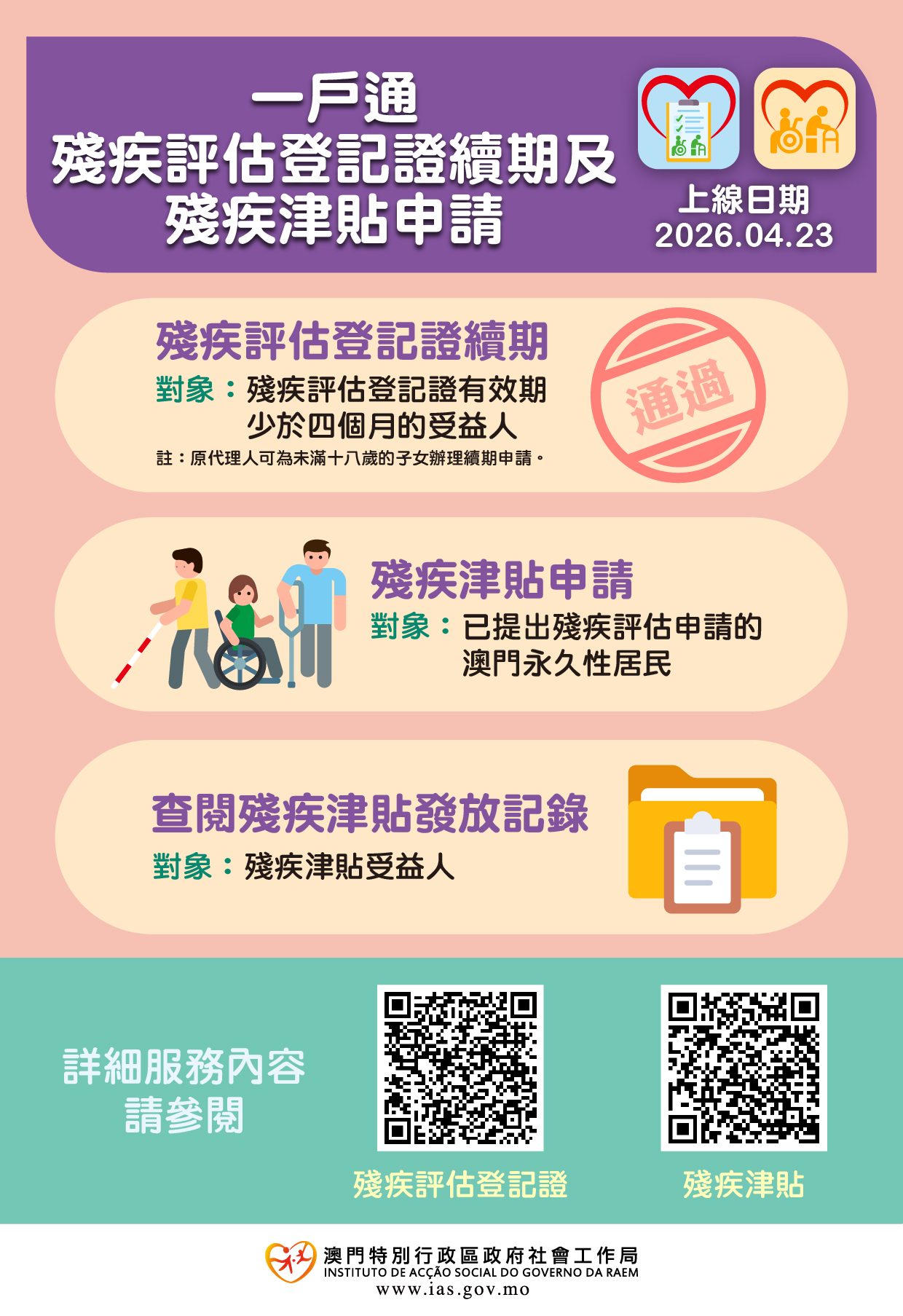 为配合特区政府电子政务发展,社会工作局明(23)日起于“澳门公共服务一户通”(简称“一户通”)提供残疾评估登记证续期及残疾津贴申请服务。