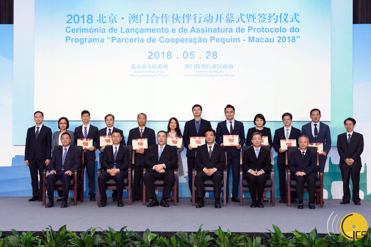 在“2018北京‧澳門合作伙伴行動”開幕式暨簽約儀式上,行政長官崔世安與北京市政協主席吉林等見證雙方代表簽署《北京市與澳門特別行政區職業培訓交流合作協議》、《澳門特別行政區政府旅遊局加入中國世界遺產旅遊推廣聯盟意向書》和《北京市體育局與澳門特別行政區政府體育局冬季體育運動合作協議書》。