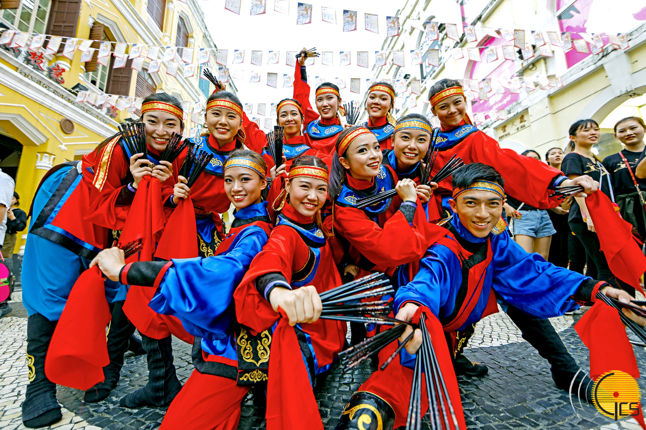 不同舞者穿梭於澳門大街小巷,一邊巡遊一邊拍照,氣氛熱鬧。