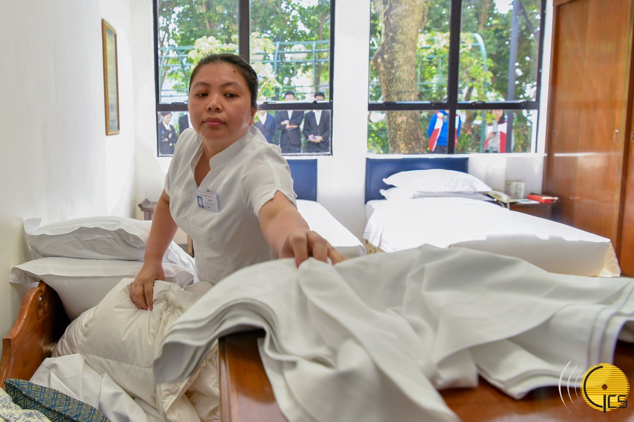 “酒店綜合服務職業技能大賽”分為兩個環節,分別是情景佈局及房間主題。由三人組成的參賽隊伍需要完成基本房務工作,並從中發現和處理相關問題。