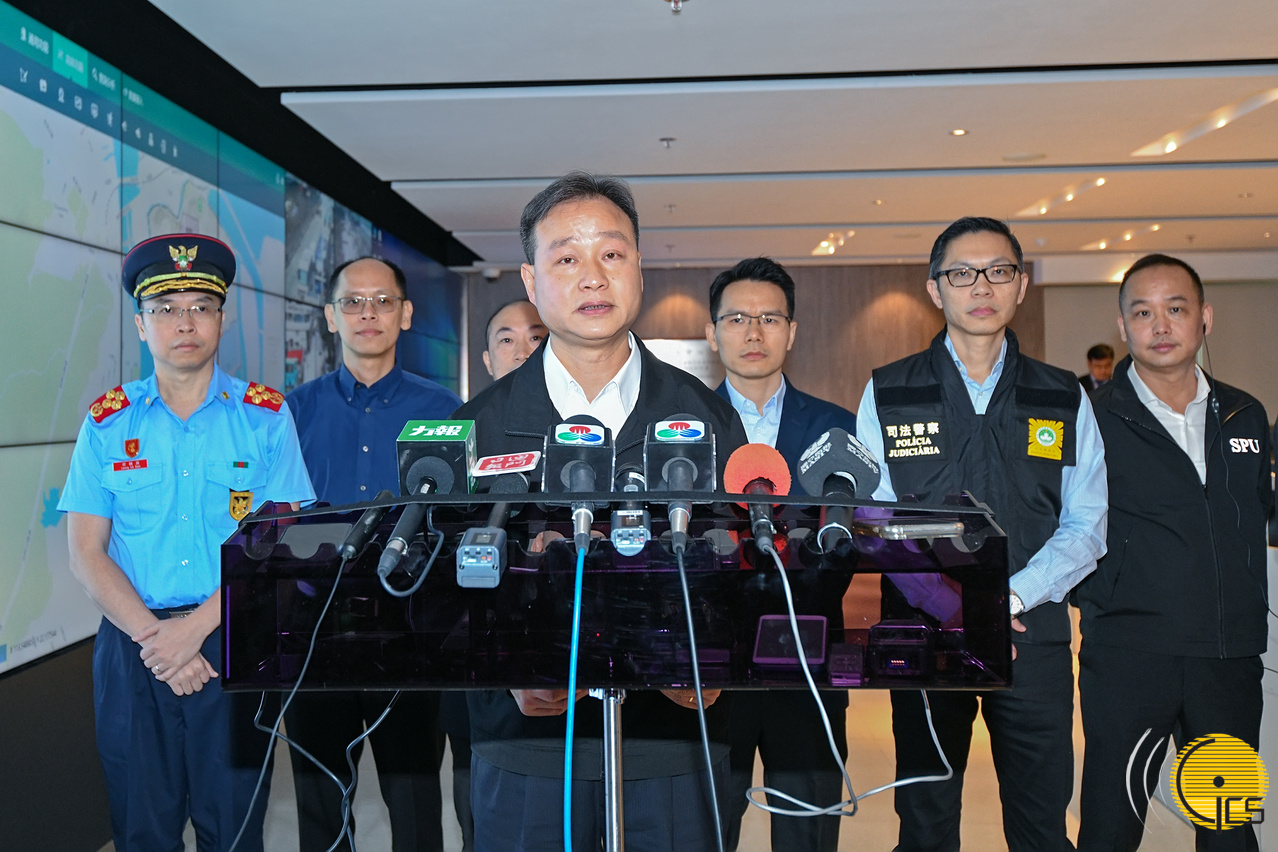 “水晶魚2019”演習-警察總局局長、聯合行動指揮官馬耀權在民防行動中心向傳媒介紹演習詳情。