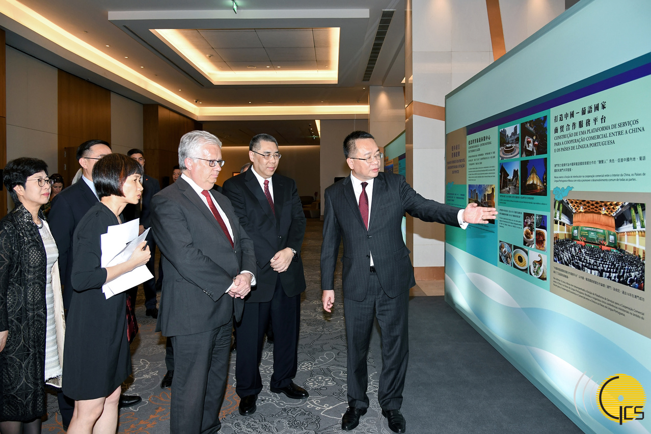 正在里斯本的行政長官崔世安與葡萄牙共和國內政部長愛德華多‧卡布里塔(Eduardo Cabrita)等嘉賓參觀“一國兩制在澳門成功實踐”圖片展