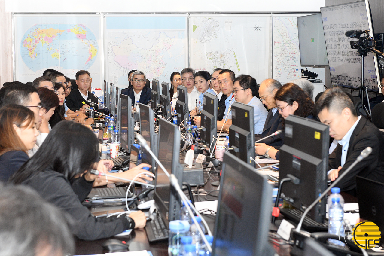 警察總局局長兼民防行動聯合指揮官馬耀權、海關關長黃有力在民防行動中心,聽取民防架構成員代表就應對熱帶風暴“韋帕”工作的總結匯報。