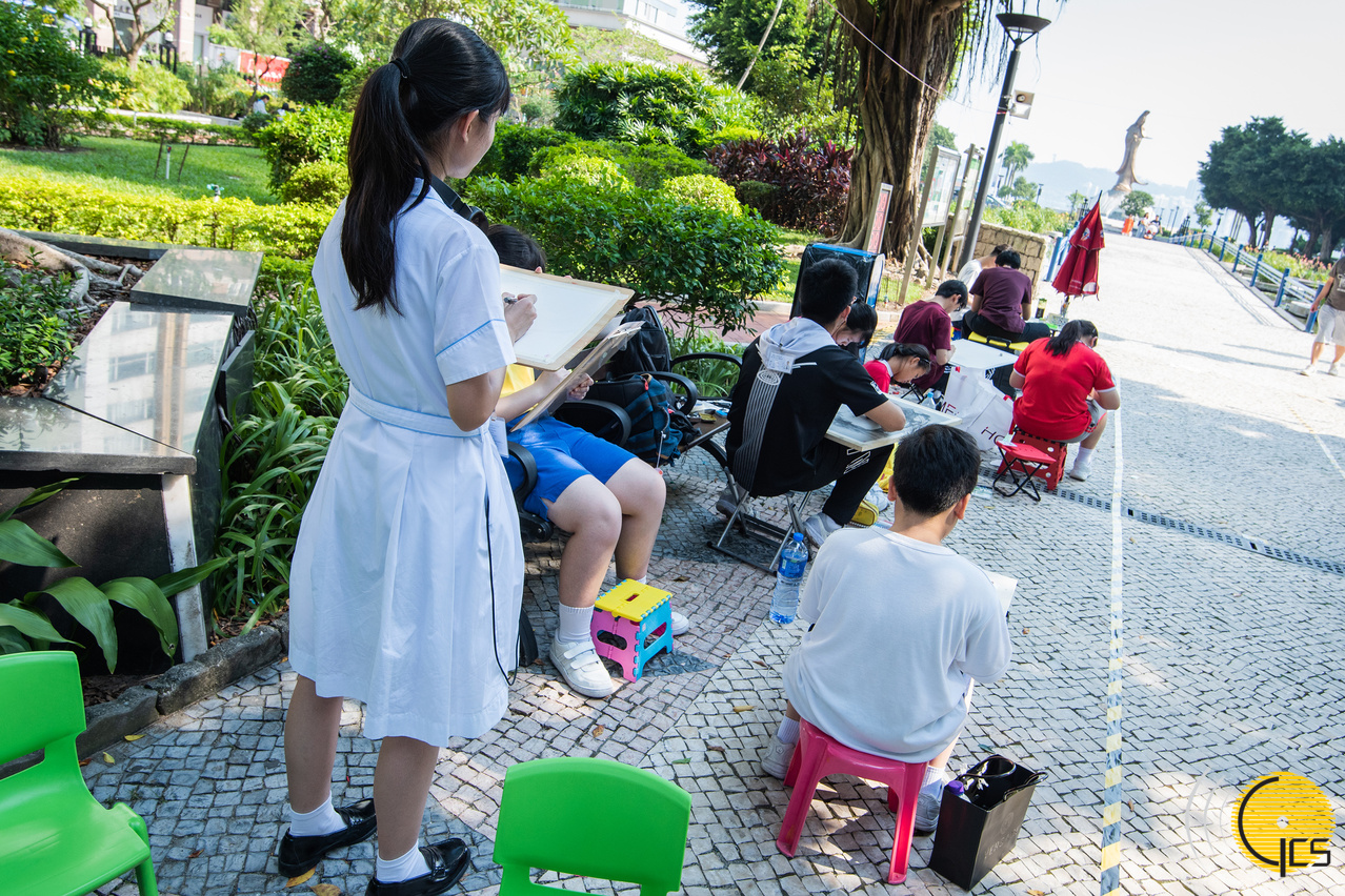 學生們在公園內以澳門風光寫生創作,形式相當豐富,有水彩、粉彩、國畫、油畫、素描等。