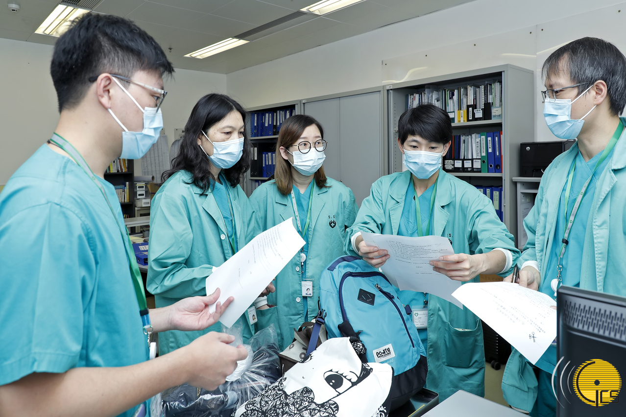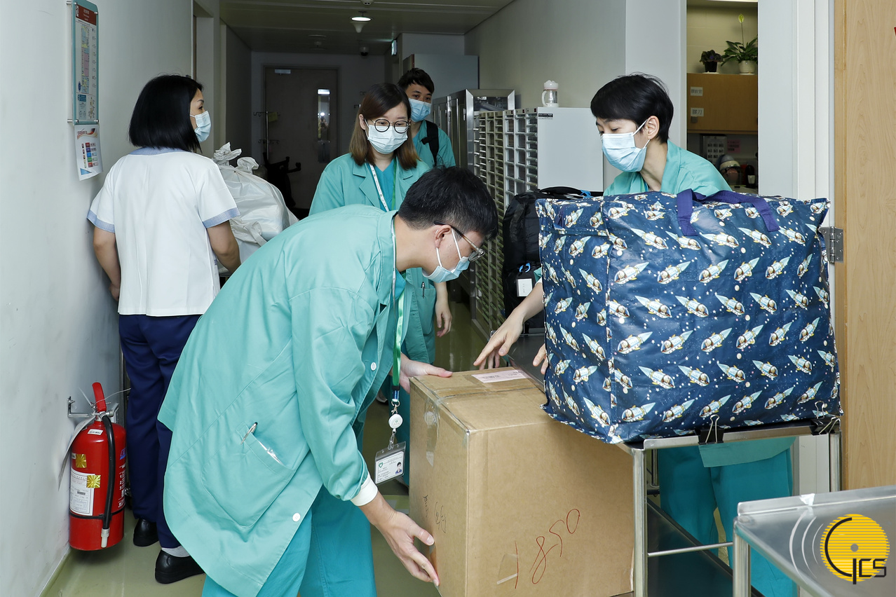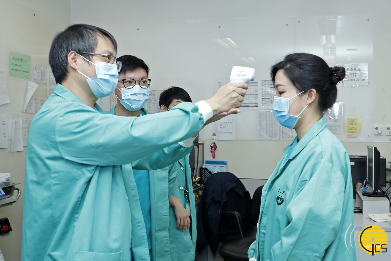 醫護人員教導機場地勤及赴湖北隨機工作人員穿著防護衣及配戴口罩等準備工作。
