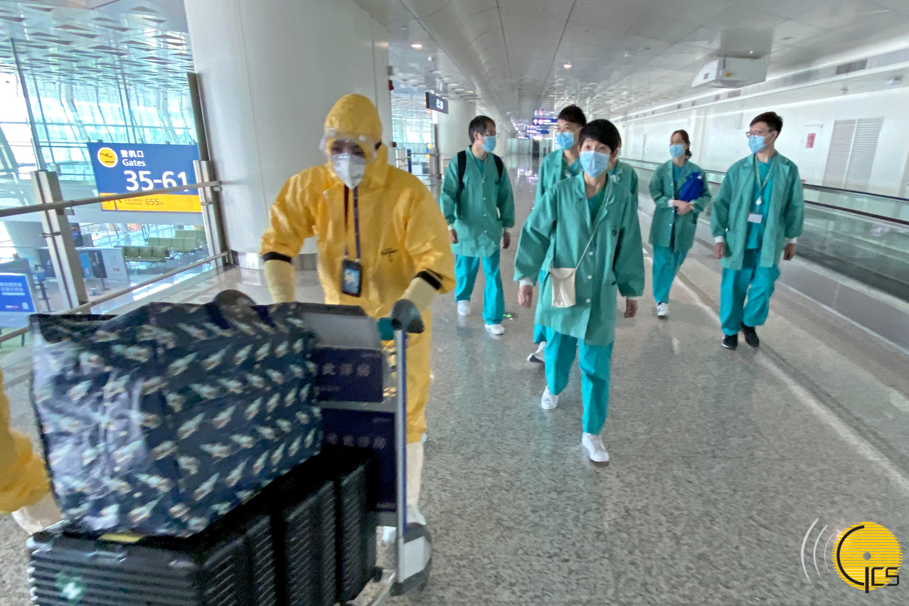 工作人員抵達武漢機場後運送檢測物資