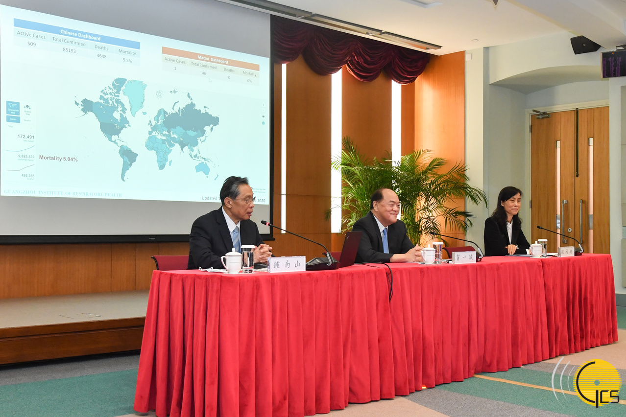 鍾南山院士(左)在政府總部與本澳參與抗疫的部門和醫護界等人士分享防控新冠肺炎疫情的經驗,行政長官賀一誠(中)及社會文化司司長歐陽瑜(右)出席。