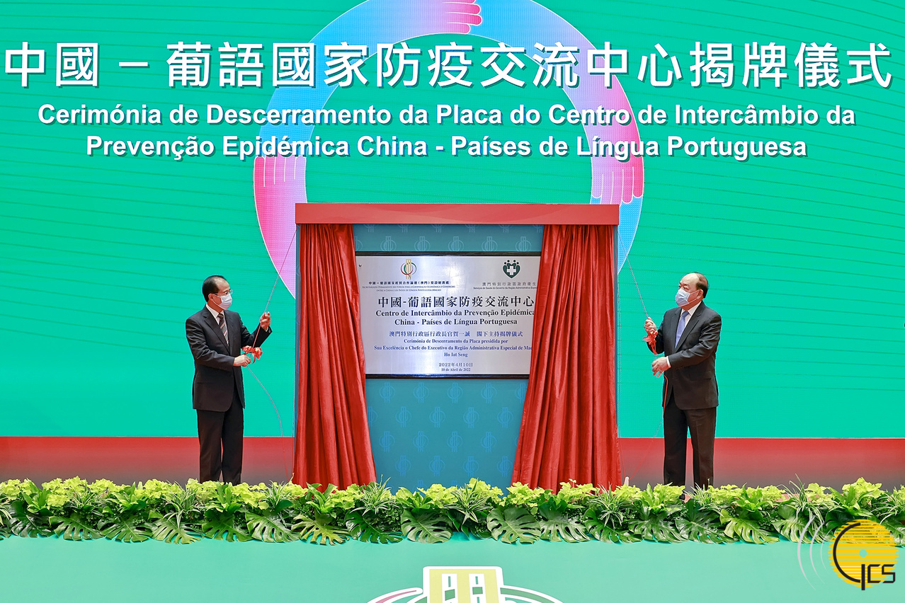 行政長官賀一誠、中央人民政府駐澳門特別行政區聯絡辦公室主任傅自應主持“中國-葡語國家防疫交流中心”揭牌儀式。