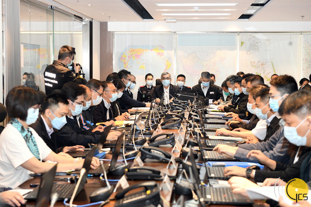“水晶魚2022”颱風演習-演習開始,民防行動中心啟動全面運作模式,就應對颱風進行工作部署。