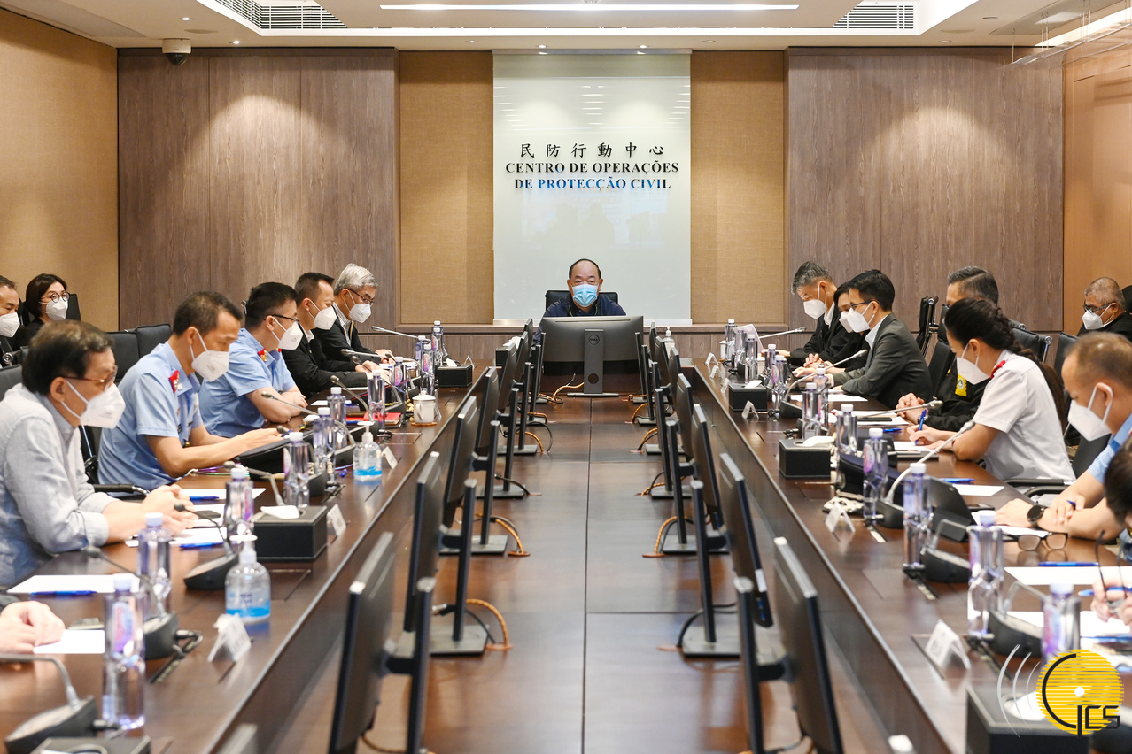 行政長官賀一誠到民防行動中心主持應對熱帶風暴“木蘭”的工作會議,聽取匯報及作出工作指示。