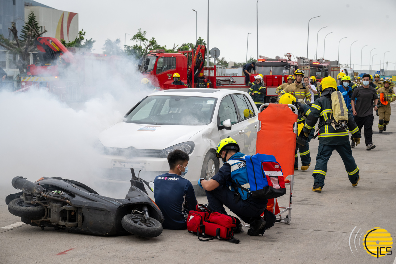 “水晶魚2024”颱風演習-消防局就颱風期間交通意外事故開展救援行動。