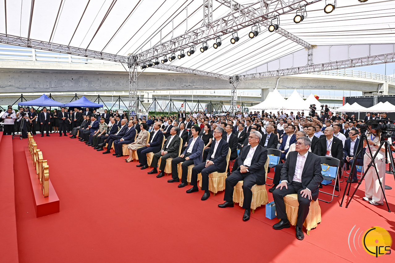 行政長官賀一誠與一眾主禮嘉賓主持澳門大橋的揭牌儀式。
