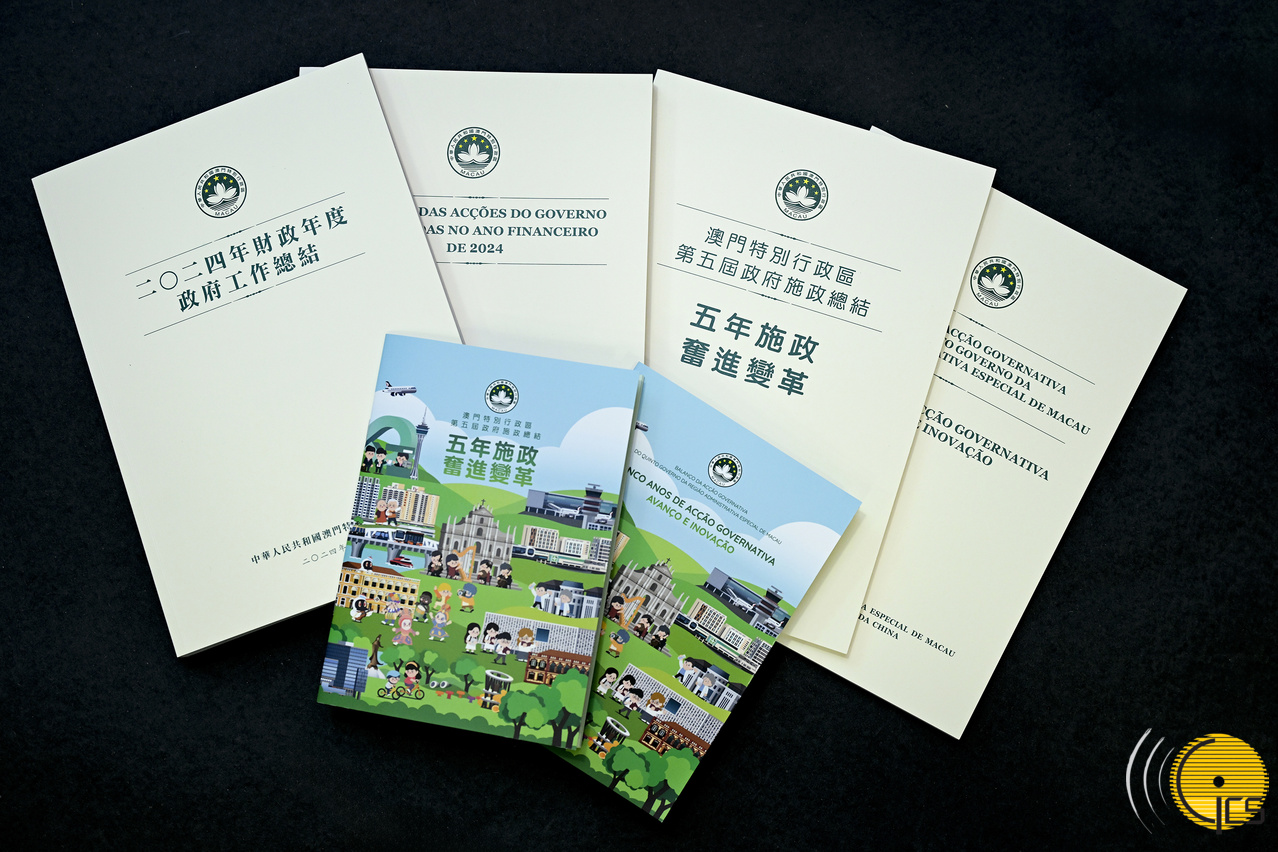 《二○二四年財政年度政府工作總結》文本、《澳門特別行政區第五屆政府施政總結》文本及相關小冊子供公眾索取。