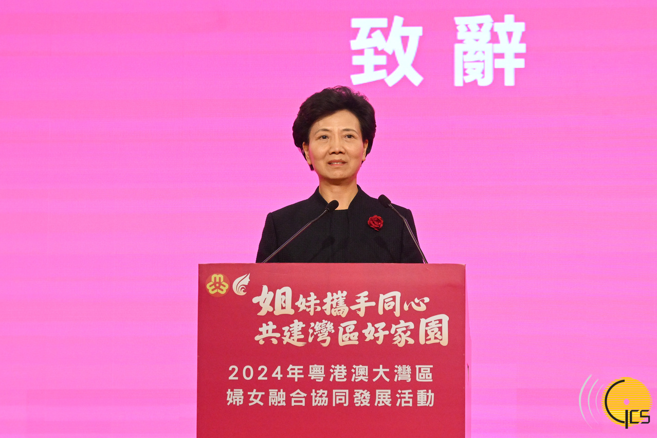 行政長官岑浩輝在“姐妹攜手同心共建灣區好家園一一粤港澳大灣區婦女融合協同發展”活動上致辭。