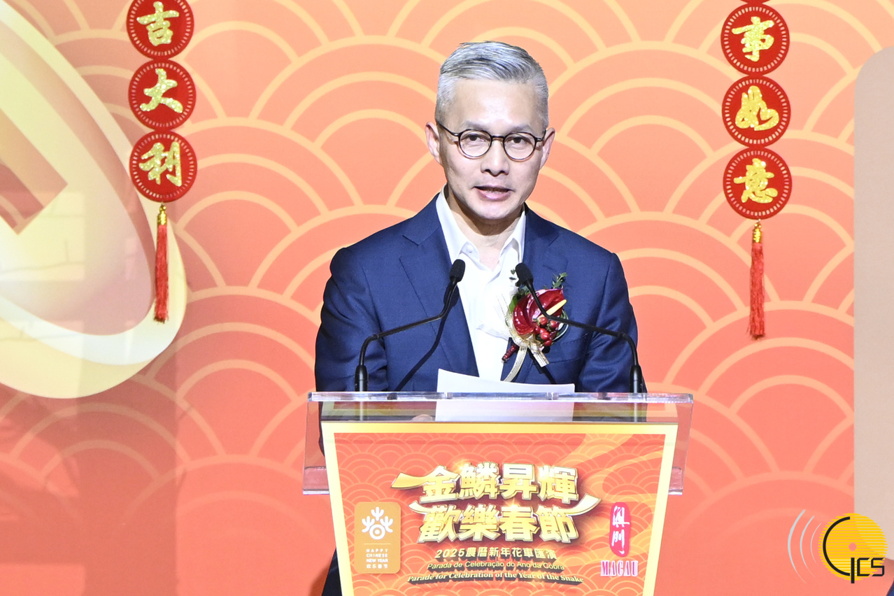 經濟財政司司長戴建業在"金鱗昇輝歡樂春節2025農曆新年花車匯演"開幕儀式上致辭